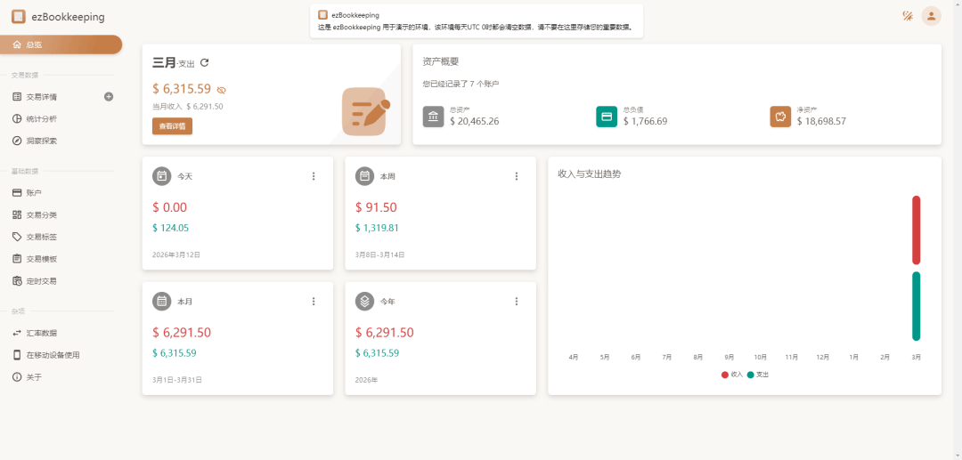 轻松自托管你的个人财务数据。这是一款免费、轻量、可自托管的个人记账应用,采用 Go+Vue 构建。它界面简洁易用、功能丰富,支持二级账户(个人/家庭)、收支分类、交易图片附件、定期收支自动记账等功能。借助 PWA 技术,可一键添加到手机主屏幕,体验媲美原生 App