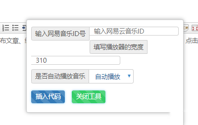 简单的一个Emlog网易音乐调用插件,安装激活后在发布文章、编辑文章页面的编辑器工具栏上有个网易音乐的ICO图标,点击后弹出输入框输入网易音乐的ID号,点击插入代码,就会自动在编辑器里插入适应多平台的网易音乐调用代码。