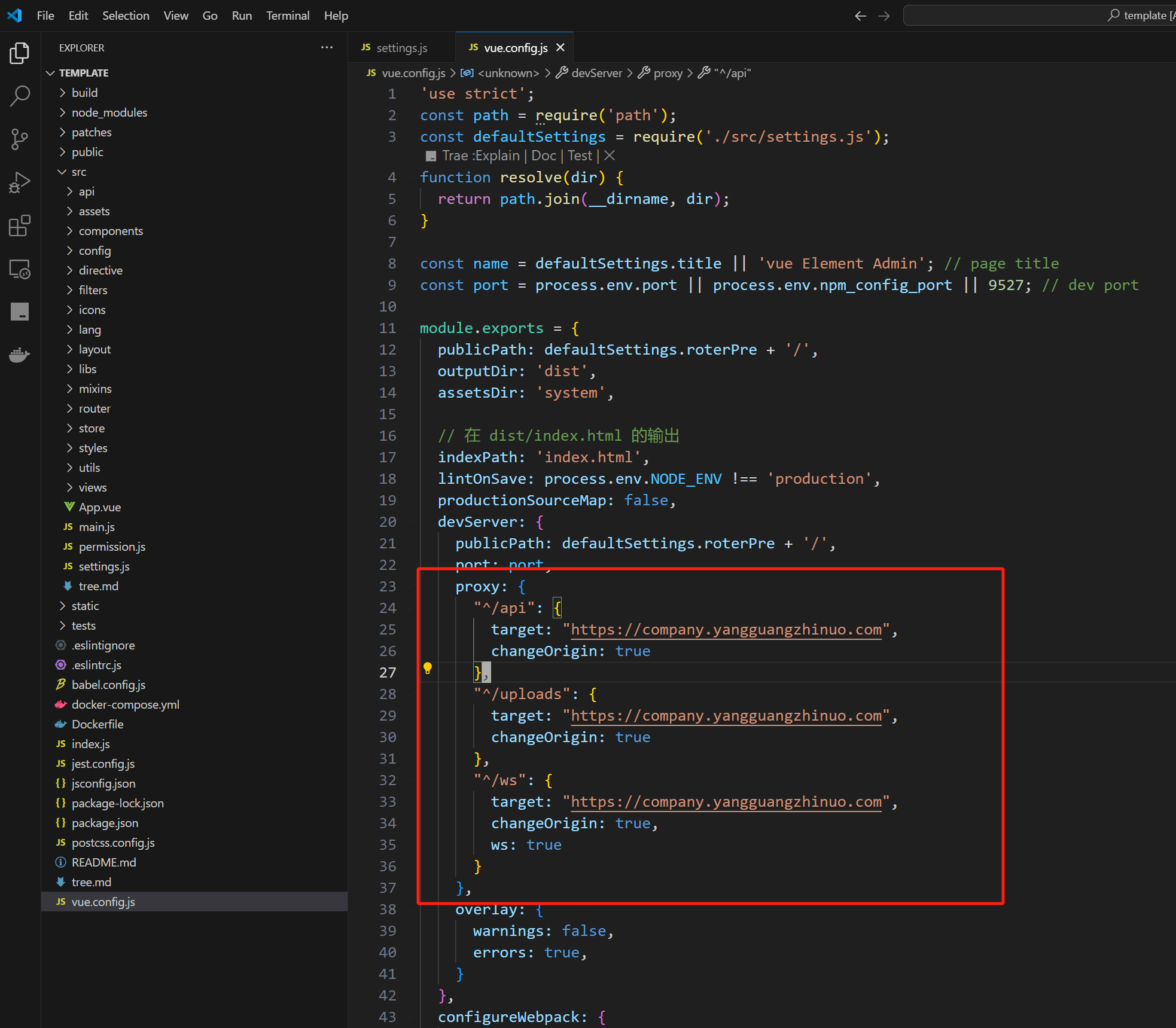 找到template/vue.config.js,然后需要改右侧的三个地址,改成你的OA域名地址,参考如下: