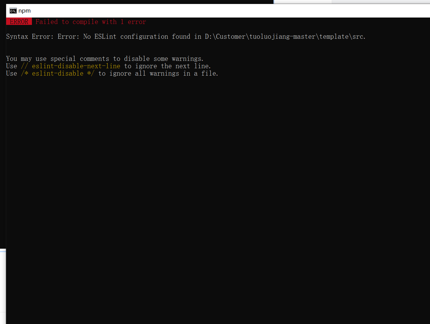如果遇到以下错误,请把附件里面的eslintrc.zip下载,解压到template目录下,然后再次执行。