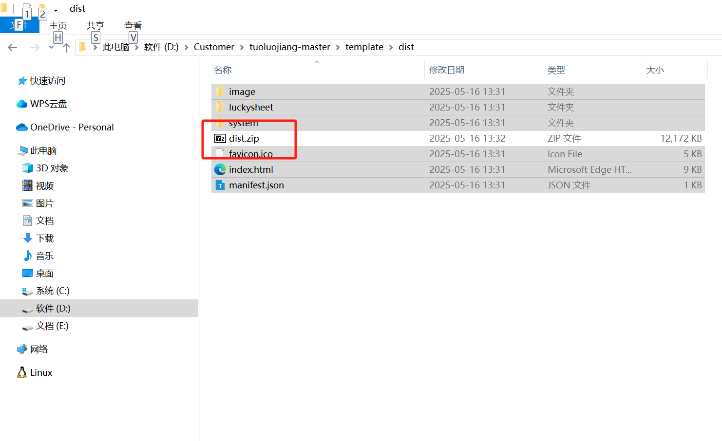 然后打开template\dist目录,把里面的文件创建一个压缩包,我这里是dist.zip。