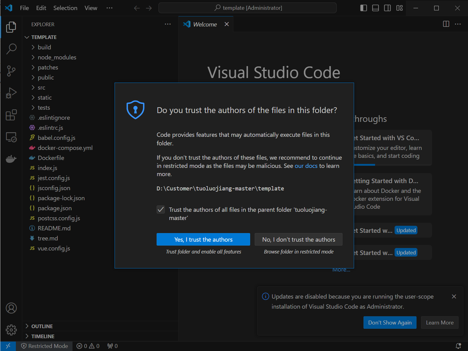 3. 安装依赖组件。在这之前先说下目录路径,开源版的前端源代码目录是template\,代码发布目录在code\public\admin。发布目录是源代码编译后,把编译后的网页文件放到发布目录,前端才能访问得到修改效果。