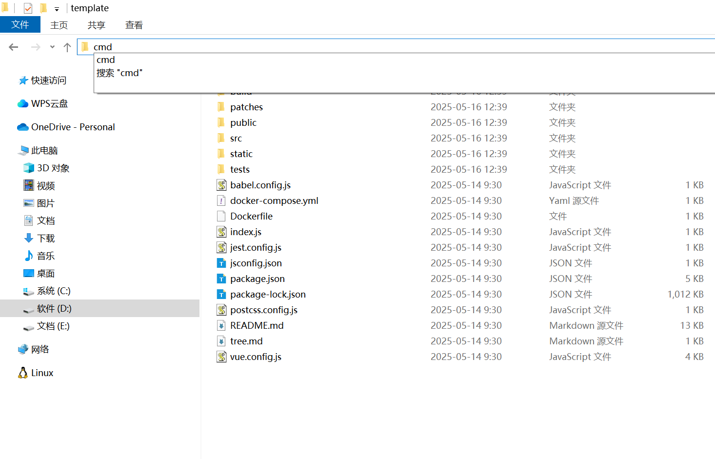 我们切换到template目录,然后在地址栏输入cmd,打开命令行窗口。(这是个小技巧,cmd打开后自动切换到当前目录)