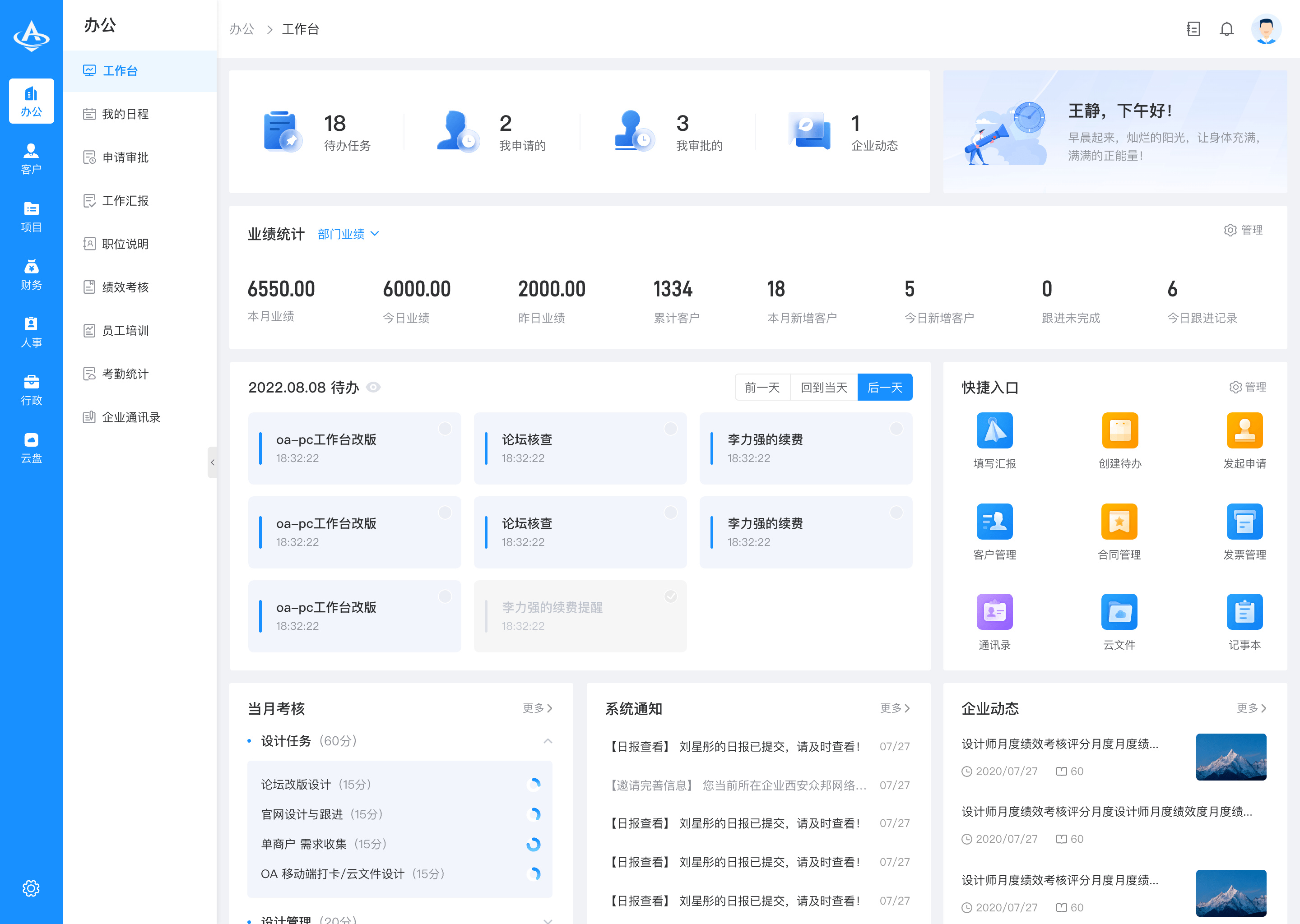 AI、低代码、考勤打卡、审批流、工作汇报、绩效管理、客户管理、合同管理、发票管理、业绩统计、项目管理、财务管理、组织架构、职级管理、岗位职责、企业动态、物资管理、云盘等……