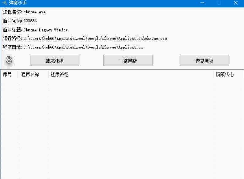 打开软件通过拖动手掌图标移动到窗口释放就会显示相关信息,然后可以选择结束线程,或者一键屏蔽,或者恢复屏蔽
