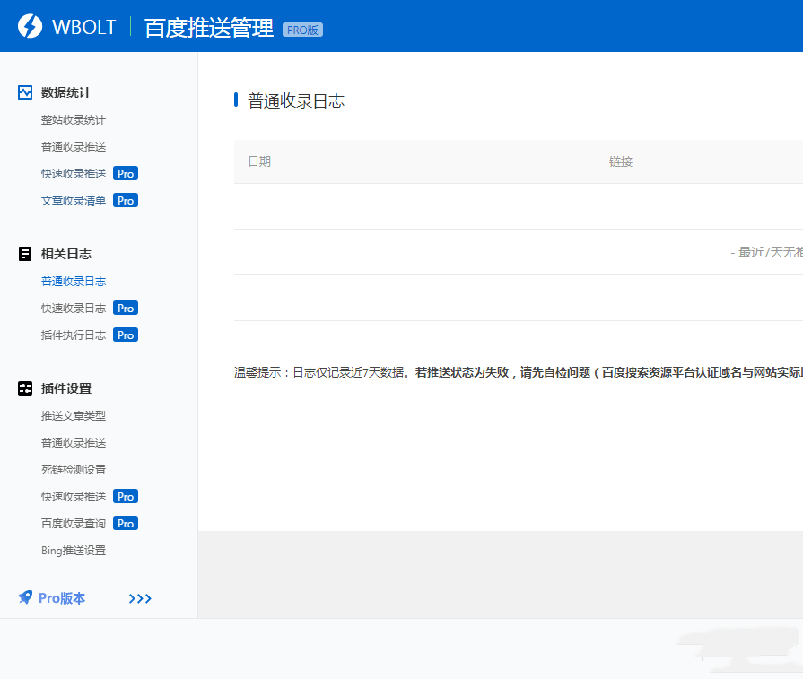 推送日志模块包括主动推送、天级推送和周级推送三种推送方式的日志,站长可以通过该功能模块查看最近7天的三种推送方式的推送URL、推送状态及收录状态。