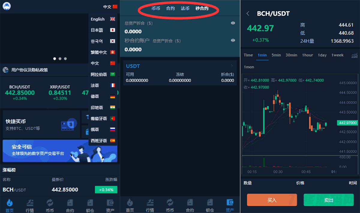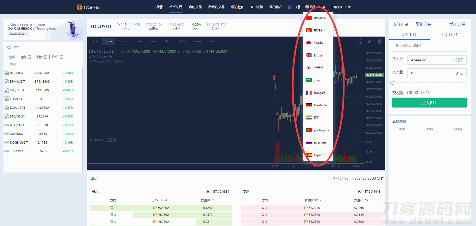 多语言交易所,12国语言,秒合约,申购,锁仓,K线完整,脚本最全,带教程,日夜模式。