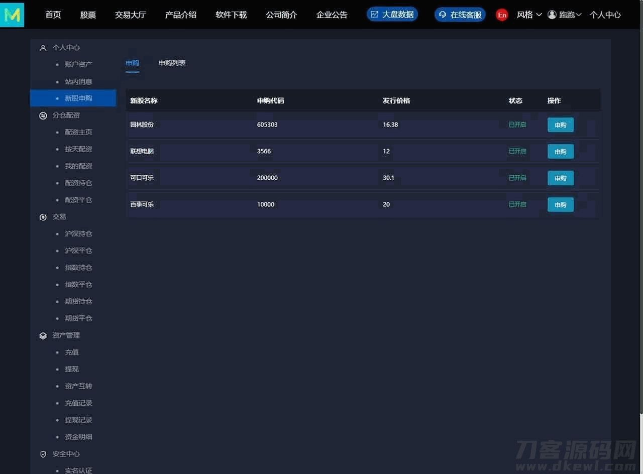 4爷免费源码网 » 【3.0新股申购】新增新股申购功能+独立新股管理后台+实时分时线和K线/配资系统源码