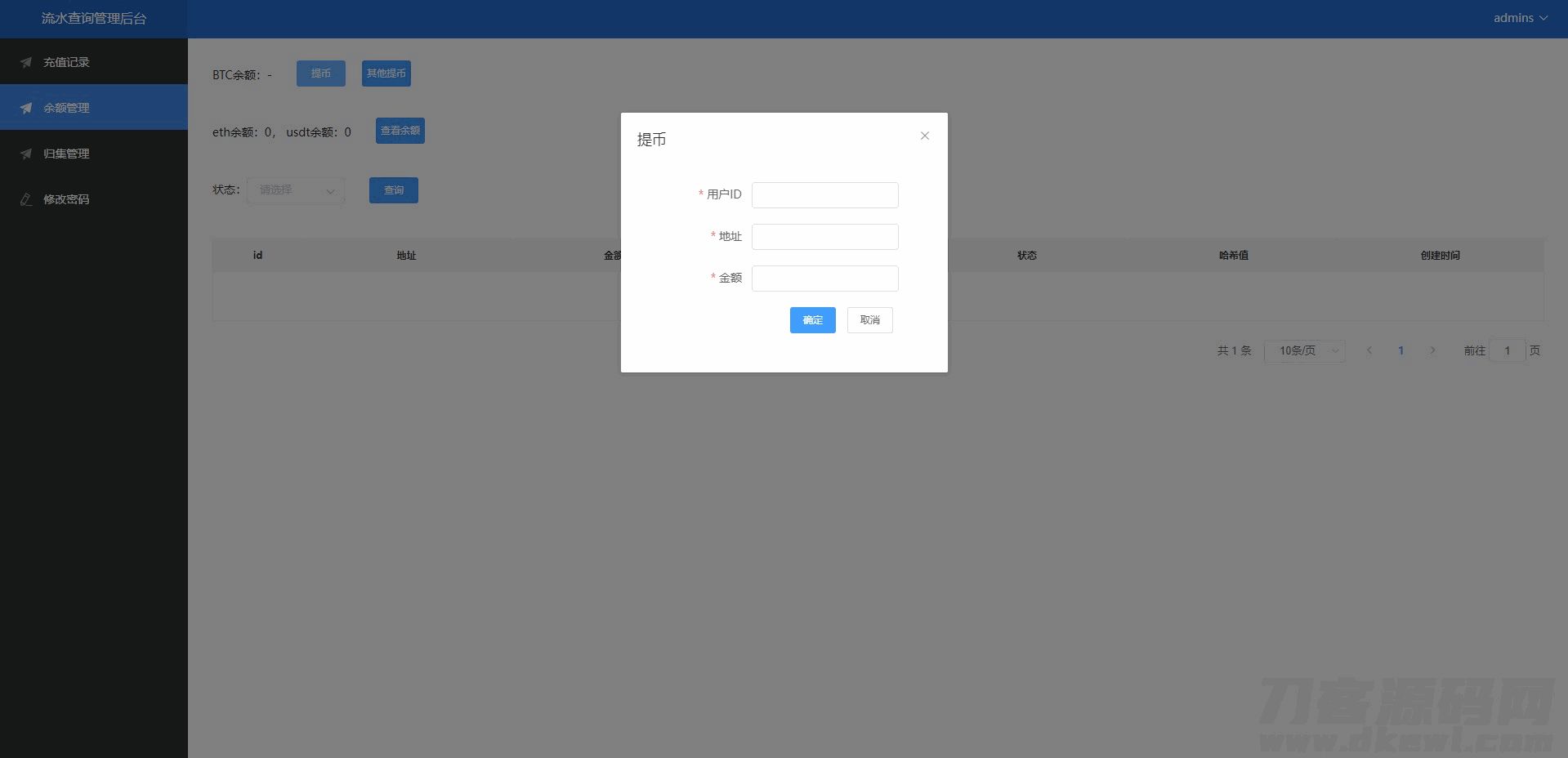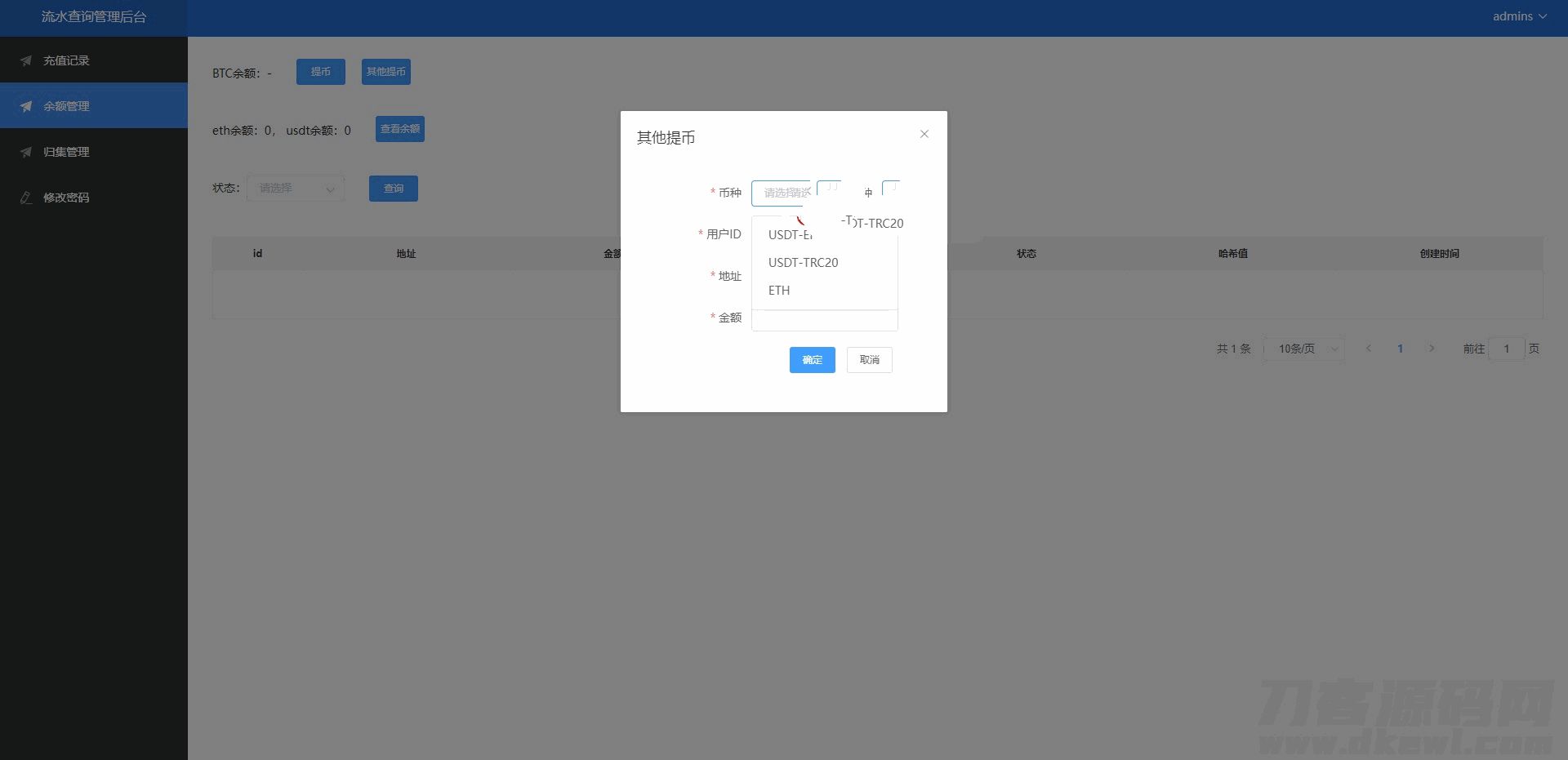 4爷免费源码网 » 二开版流水查询系统/虚拟币查询多方式提币系统源码下载