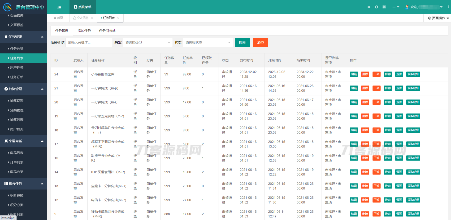 任务管理:包含平台的任务列表和用户任务列表,以及任务订单的相关管理。