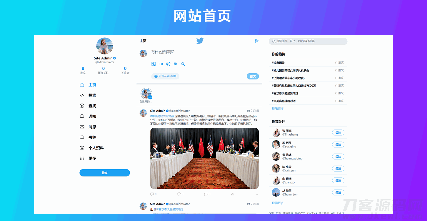 这是一款类似于Twitter网站的源代码。利用原代码,你可以快速搭建自己的社交网络平台。程序语言是PHP。数据库采用Mysql。与此同时系统带有注册,评论,转发等功能。注册用户可以分享他们的图片视频,或者创建投票的。同时系统自带FFmpeg功能上传视频会自动获取封面。还自带域名解析功;分享网址会抓取网站的描述和标题。配合后台管理面板,你可以快速设置所有的一切