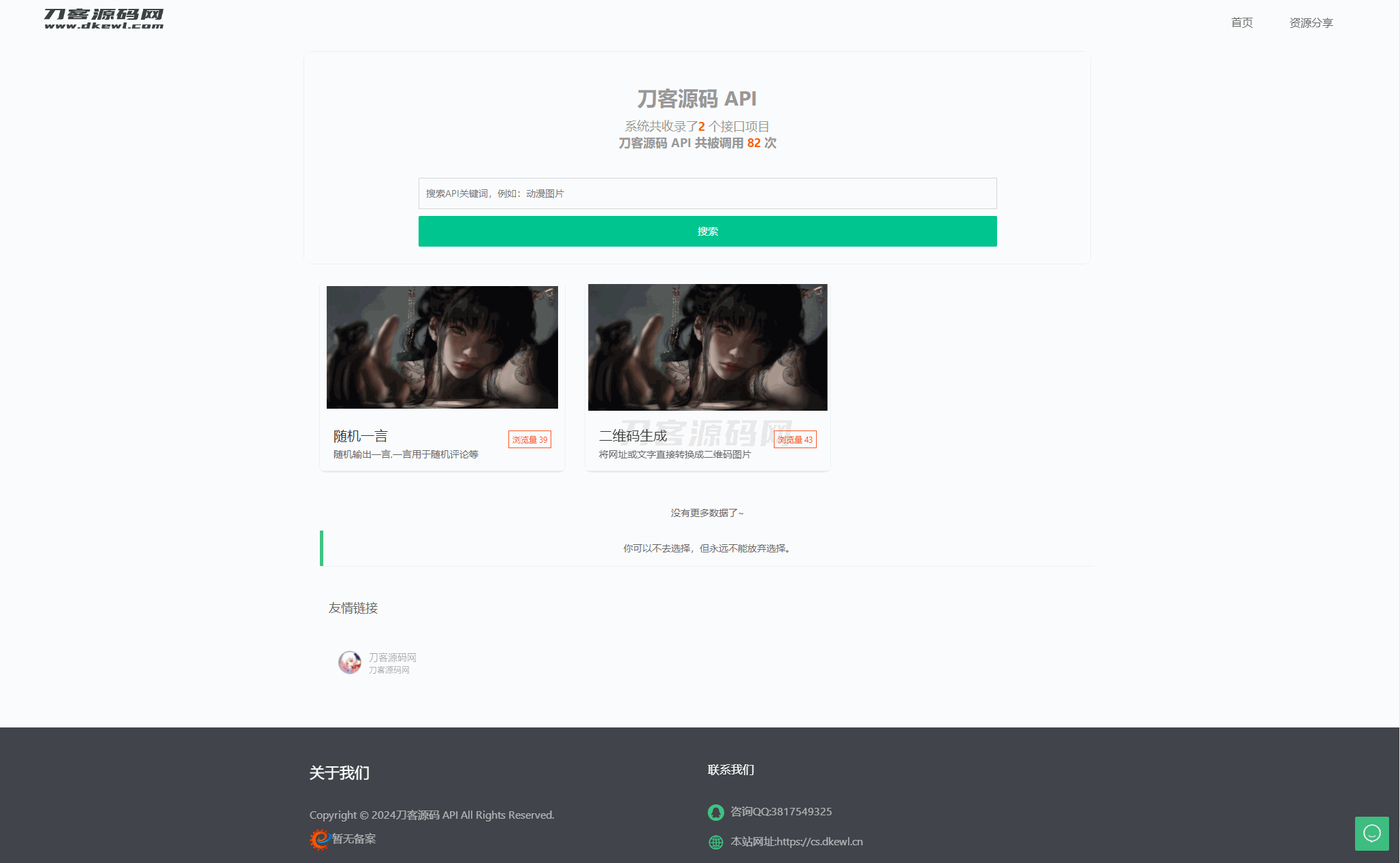 本系统为API系统,实现了api集成等基础功能,以后可能会更新key调用api,或者实现付费功能,敬请期待,前端模板均无加密,用户可自行二开,具体请看图