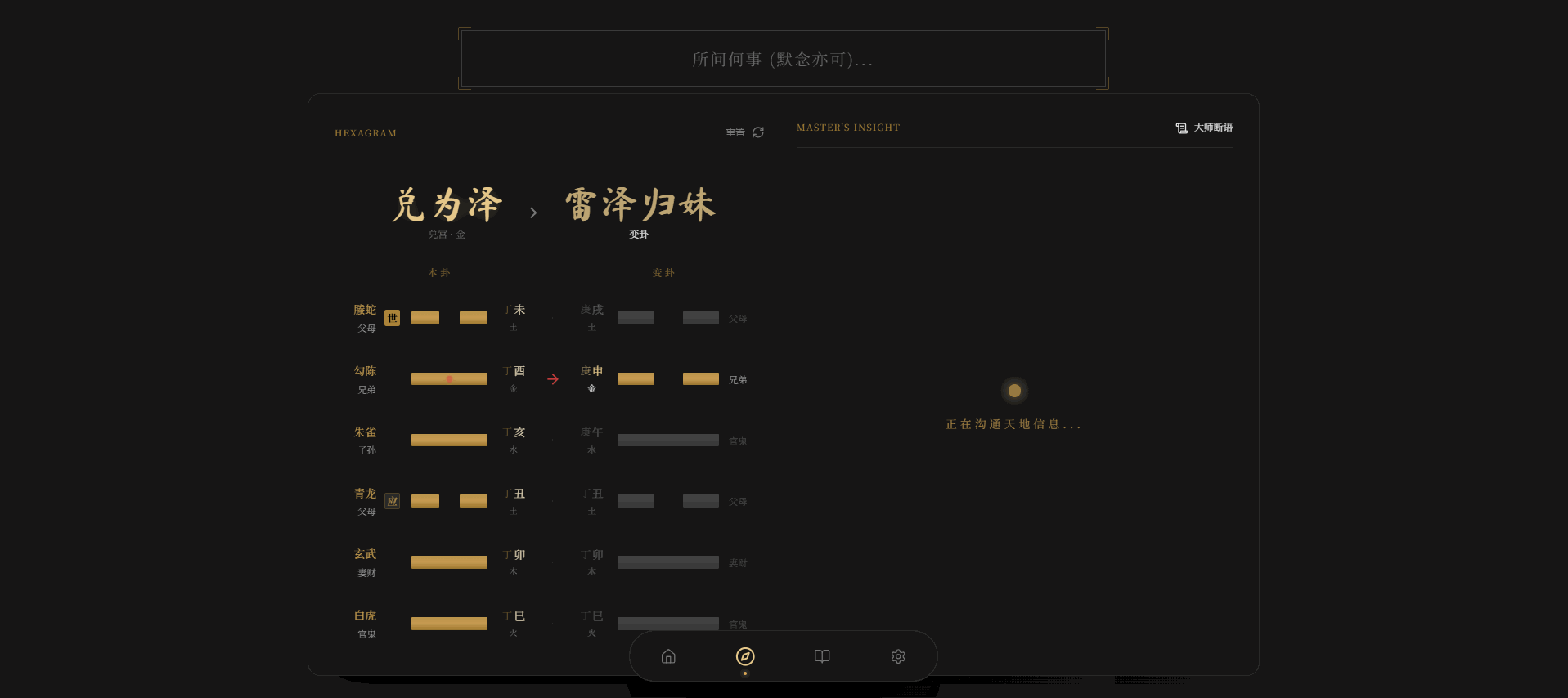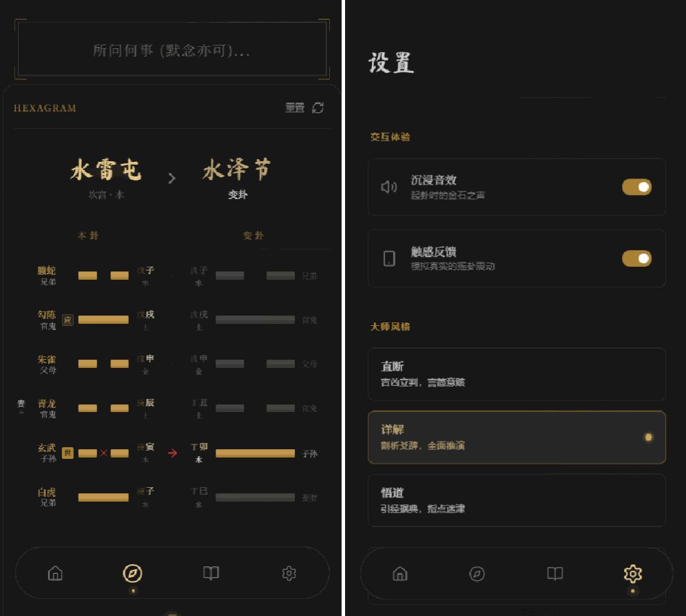 功能完整:支持手动指定卦式、时间自动排盘,涵盖感情/事业/财运等占问事项,展示本卦、变卦、六亲、伏神等信息;