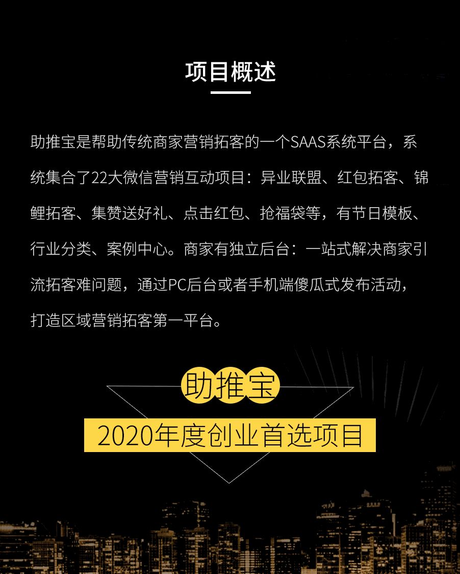 助推宝是帮助传统商家营销拓客的一个SASS系统平台,系统集合了 14 大微信营销互动项目:异业联盟、积攒送好礼、点击红包、抢福袋等,有节日模板、行业分类、案例中心。