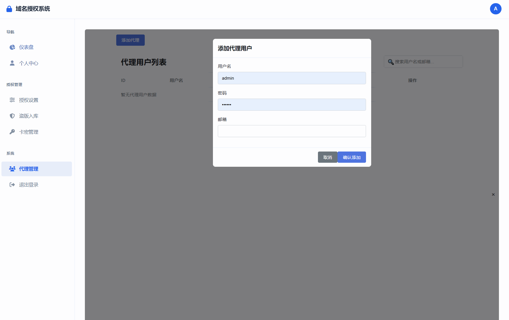 目前支持卡密兑换和后台手动增加,有代理功能,独立代理后台,代理可以无限生成卡密