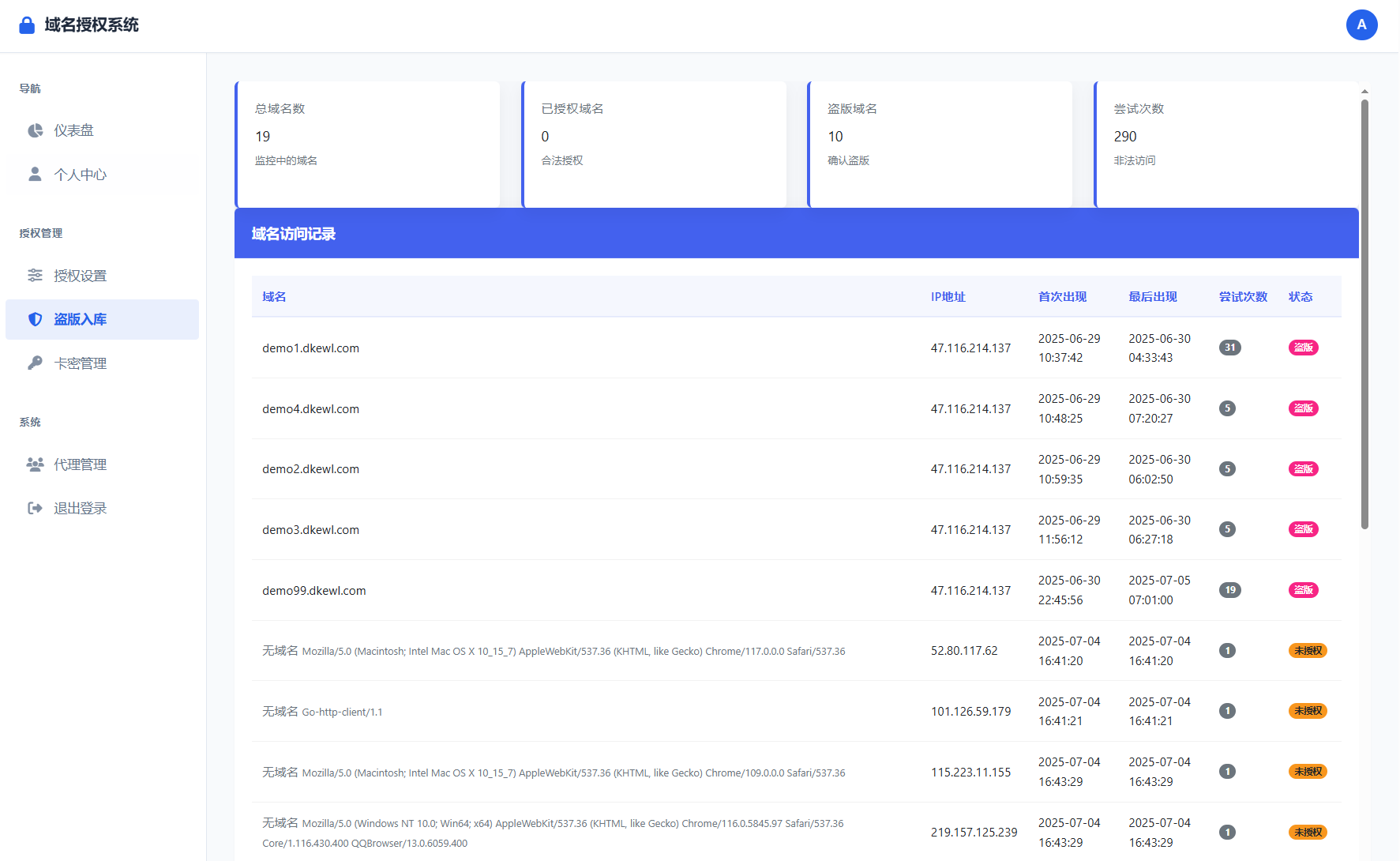 支持盗版入库,程序没有授权被使用,会在后台自动生成一个域名访问记录