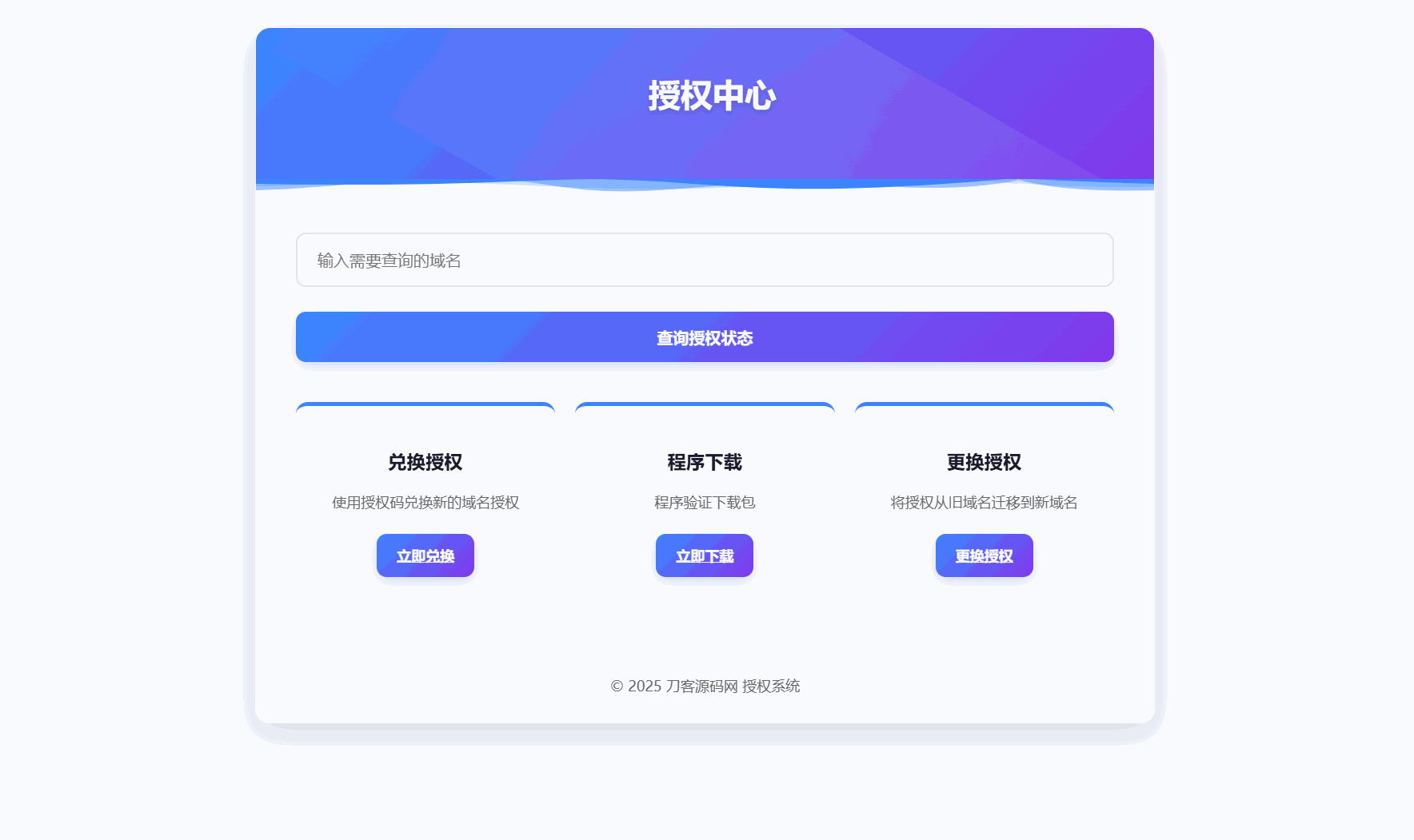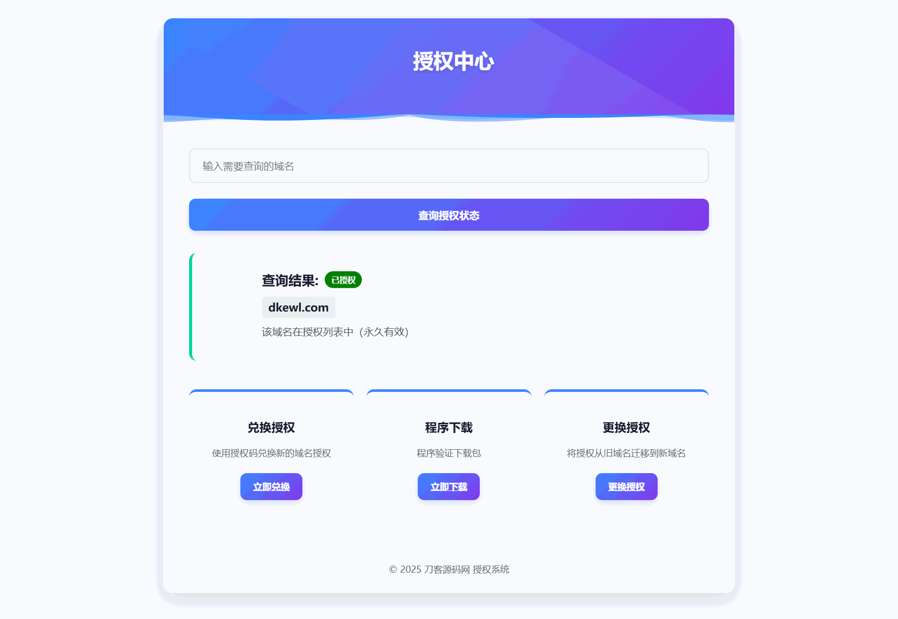 测试了一下,里面有一个文件有加密,其他的都是开源的,不影响二开,功能也满足日常所需,前端挺简洁美观,支持查询授权、卡密兑换授权、程序下载,更换授权等,自适应手机/电脑端