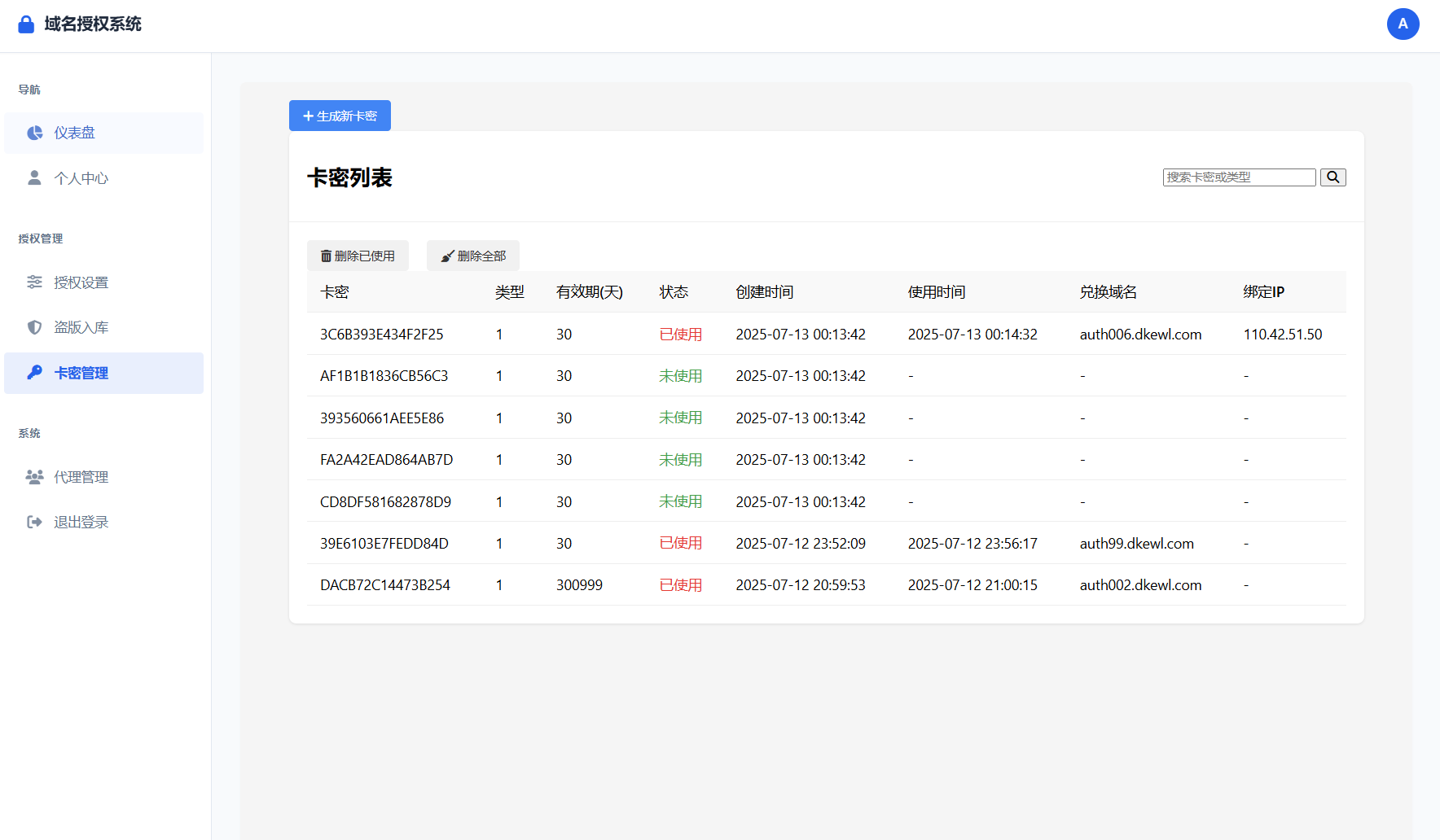 前台支持自助更换授权,可批量生成,支持自定义设置到期时间
