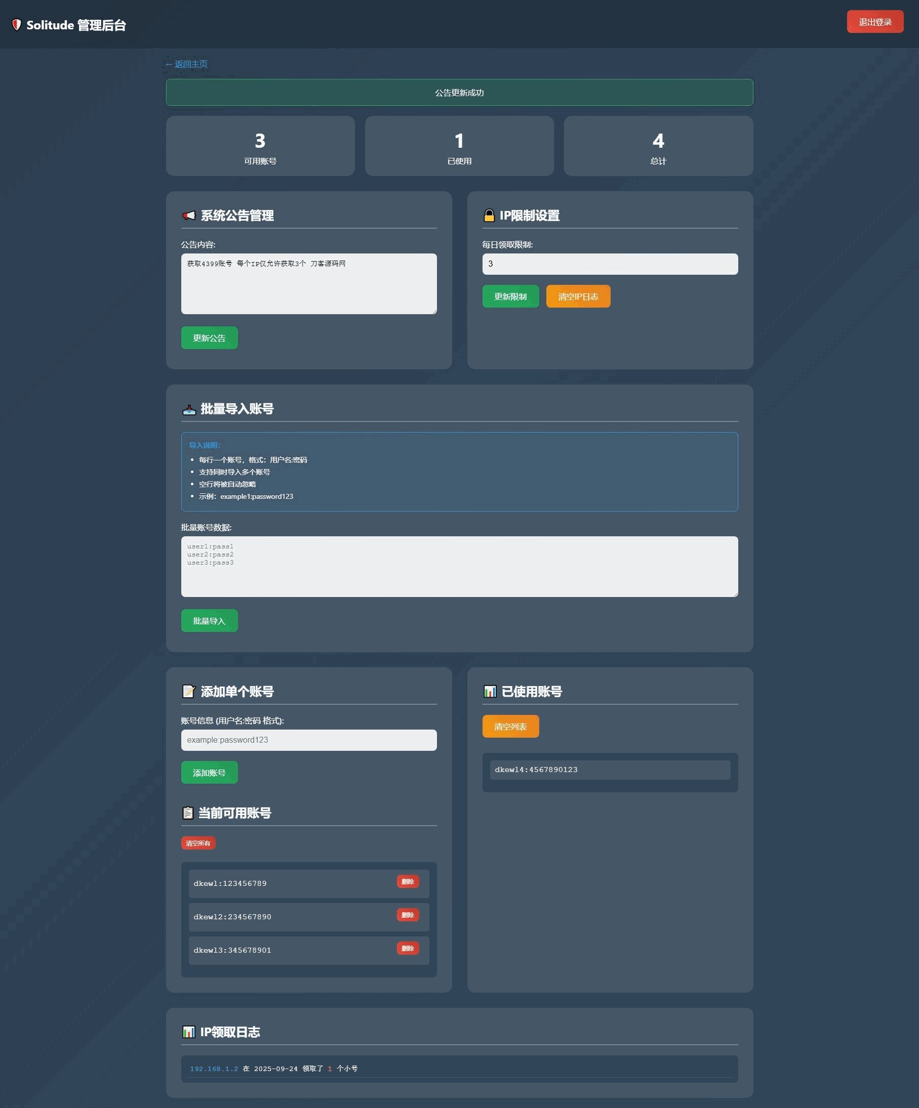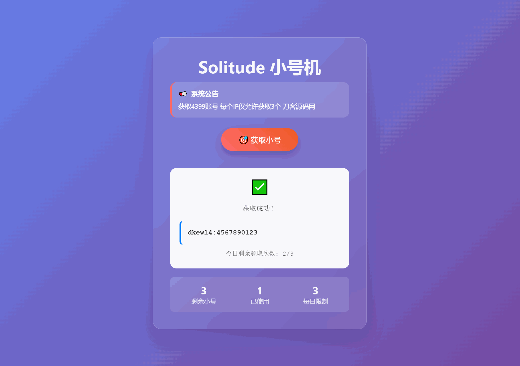4爷免费源码网 » 小号分发 卡密分发系统网站源码 轻量化