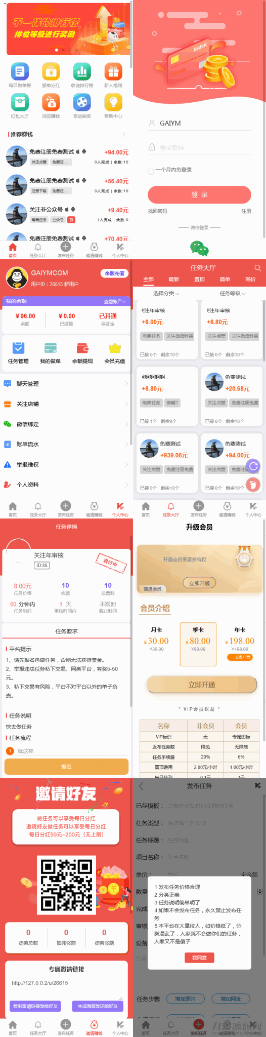 开发悬赏任务兼职系统,仿蚂蚁帮扶众人帮平台,功能齐全,包含接任务,发布任务,店铺关注,置顶推荐,排行榜,新人福利,红包大厅,红包抽奖,任务步骤,微信绑定,分销推广,举报维权,vip会员特权等众多功能,已有客户上线运营,支持微信绑定登陆。