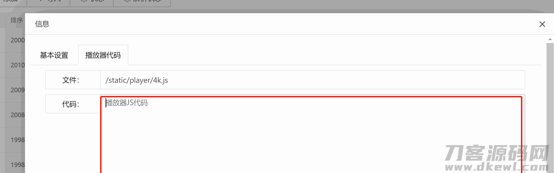 4、如需播放器结束之后自动下一集将刀客修复专用 js 代码放入苹果 cms 播放器代码中如下图红框中