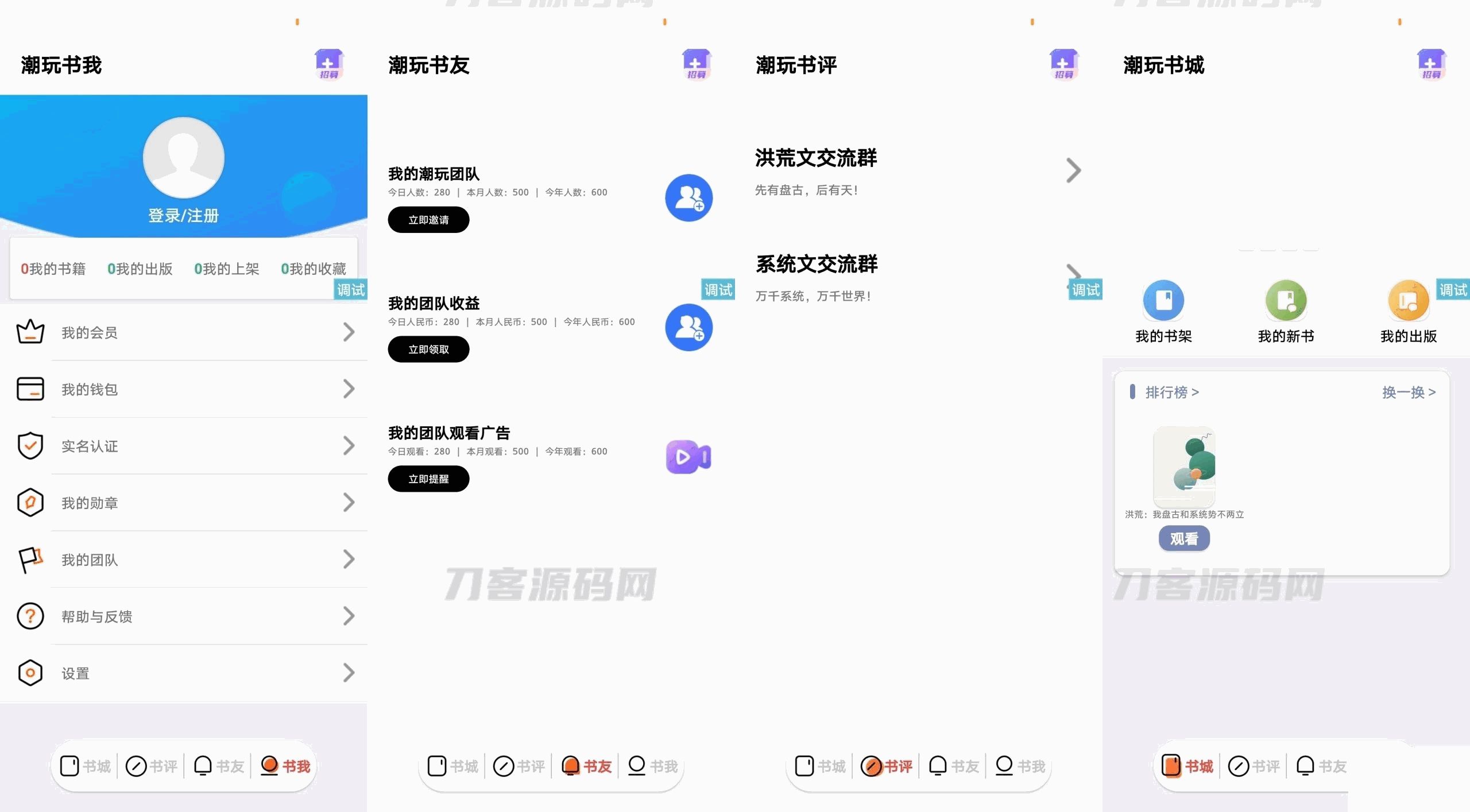 这款热门项目是潮玩宇宙防制品的源码,内置了导航栏功能。书城模块作为首页,可以观看小说;书评模块可用于交友聊天;书友模块则是平台收益的来源;而书我模块则是个人中心。