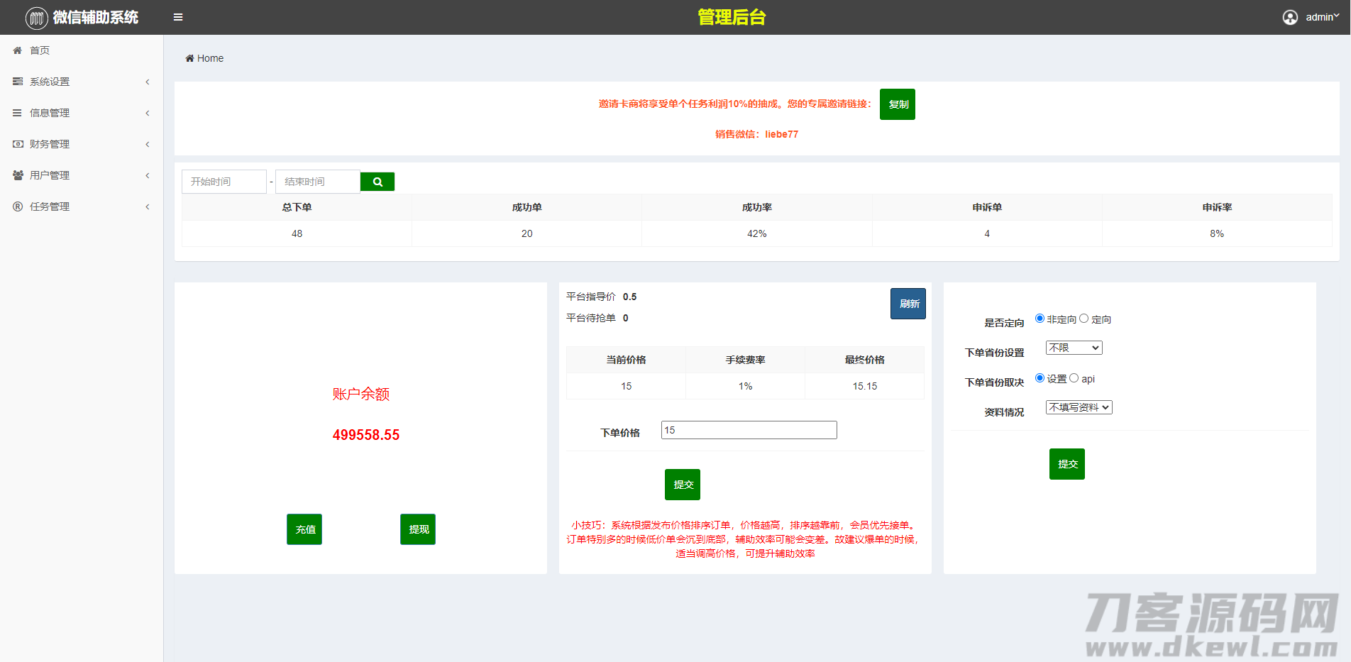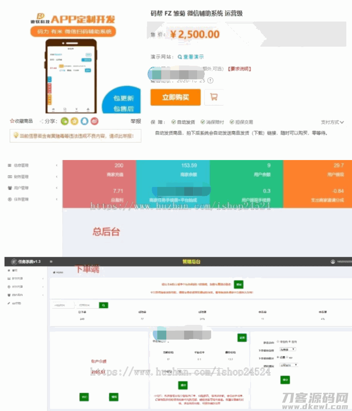 本系统包括:做单端、下单端、总后台三端。结合微信辅助流程,严格定制的一套自动化任务平台。
