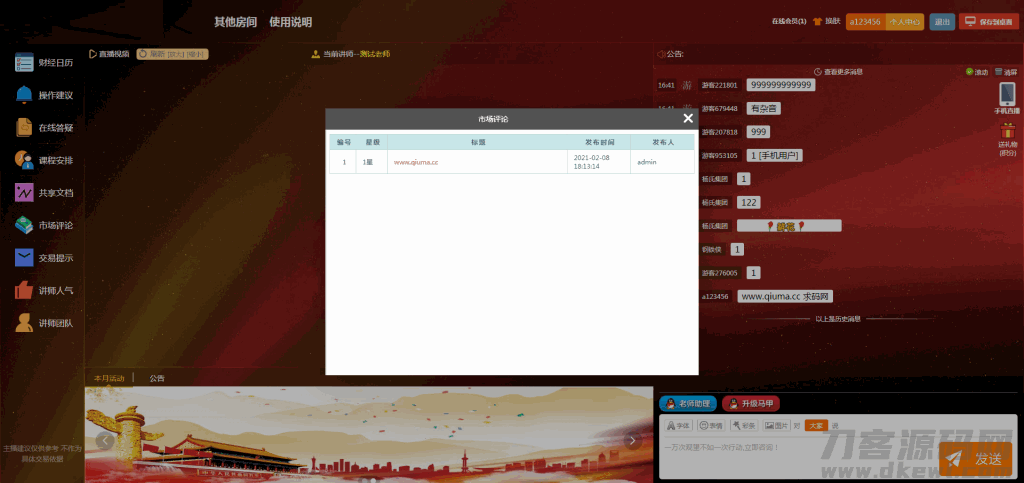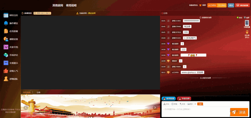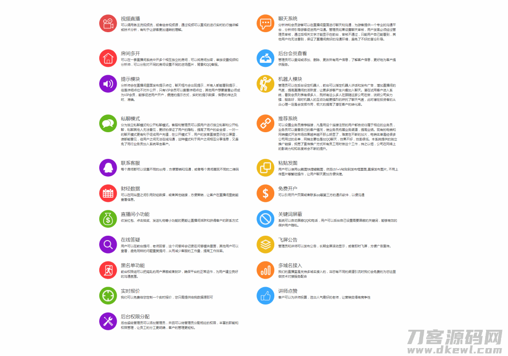 聊天审核/喊单提醒/客户管理/素材更换/讲师包装/水军操作/课件下载/观点发布/聊天互动/观看直播/联系客服/公告展示等