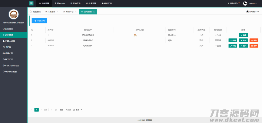 可以在一套直播间系统中开多个相互独立的房间,可以将房间加密,单独设置视频和分析师,可以分别对不同的房间设置不同的进场图片,背景和QQ客服。