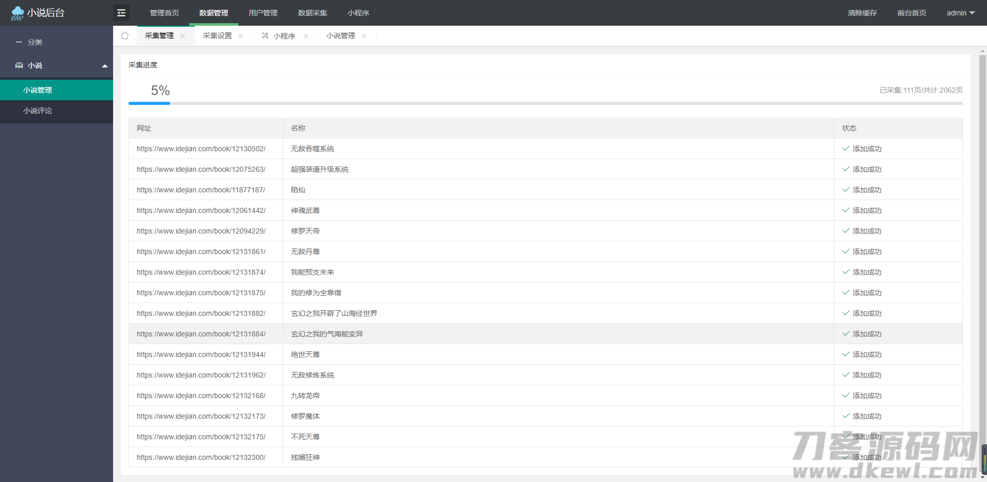 小说的话就点击数据采集然后采集就可以了小程序首页轮播推荐和首页分类显示点击数据管理然后点击小说管理
