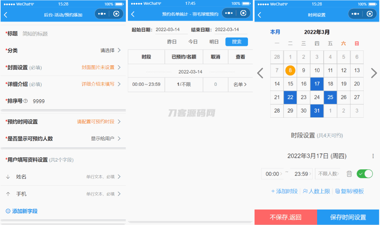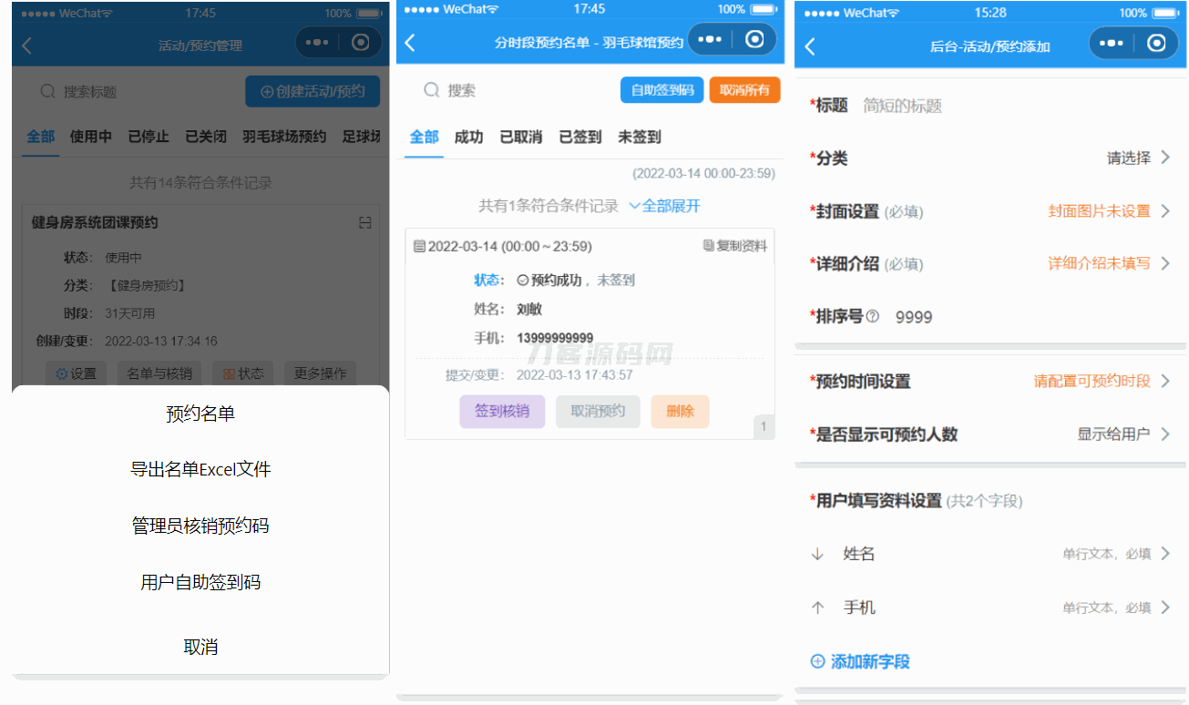 场馆预约管理:开始/截止时间/人数均可灵活设置,可以自定义客户预约填写的数据项