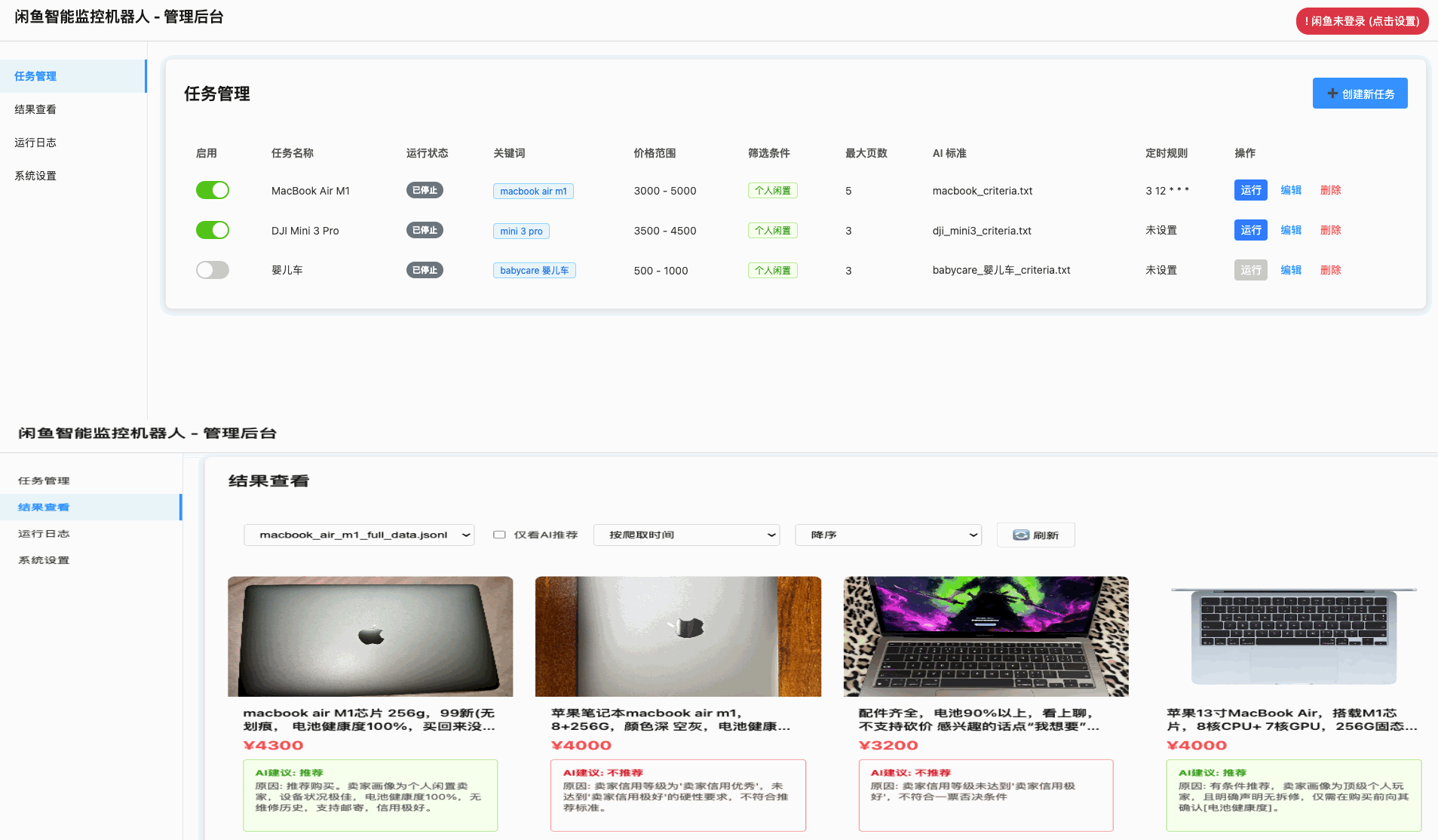 一个基于 Playwright 和AI过滤分析的闲鱼多任务实时监控与智能分析工具,配备了功能完善的 Web 管理界面。