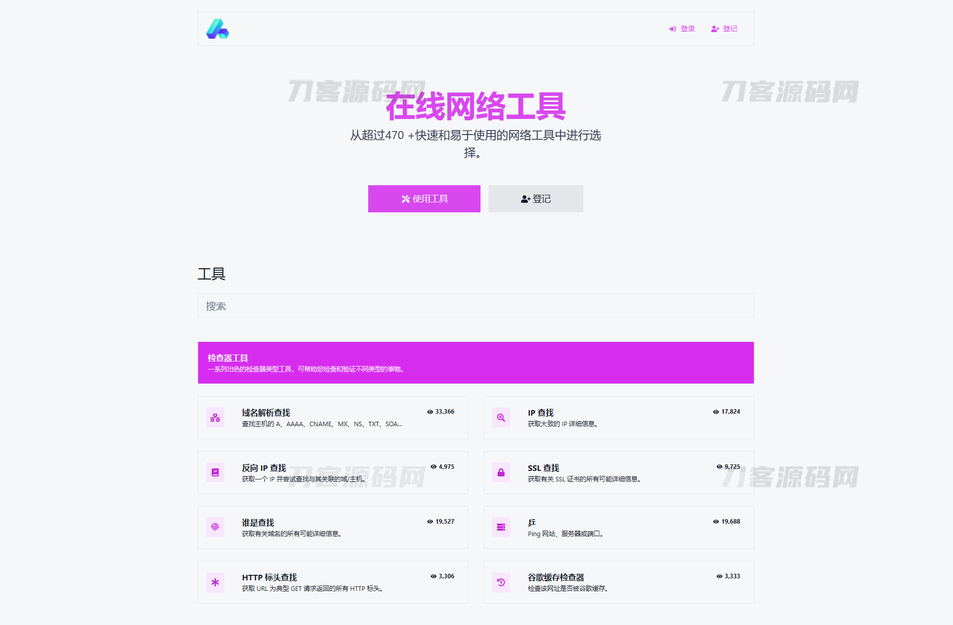 DNS 查找工具。IP 查找工具。SSL 查找工具。Whois 查询工具。Ping工具。MD5 生成器工具。Base64 转换工具。Base64 图像转换工具。