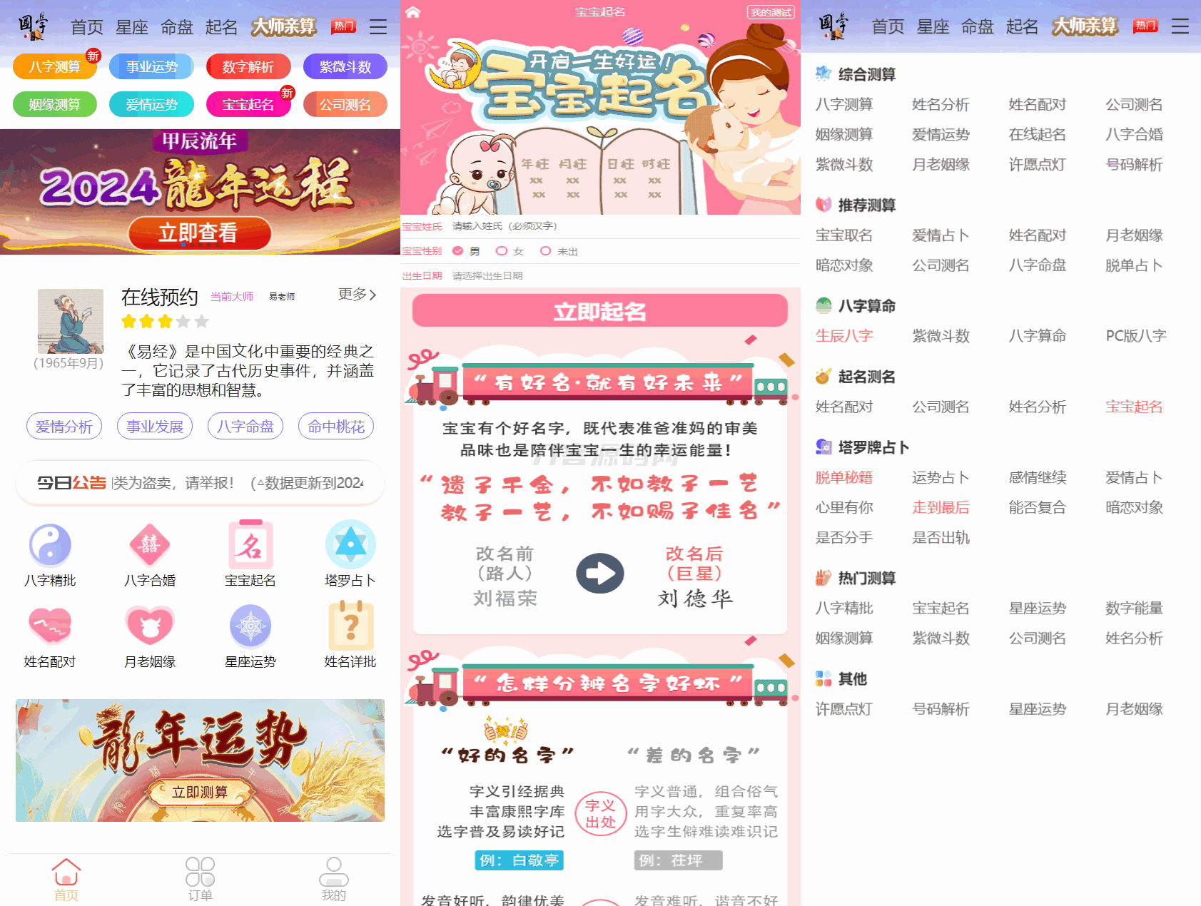 4爷免费源码网 » 2024龙年新版ui周易测算网站H5源码/在线起名网站源码/运势测算网站系统源码