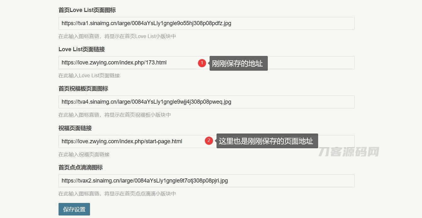 第三步:进行主题设置,这里就不多说了,都能看得懂,图片,图标直接填直链即可。页面地址就填刚刚保存的,填到对应的设置项里。