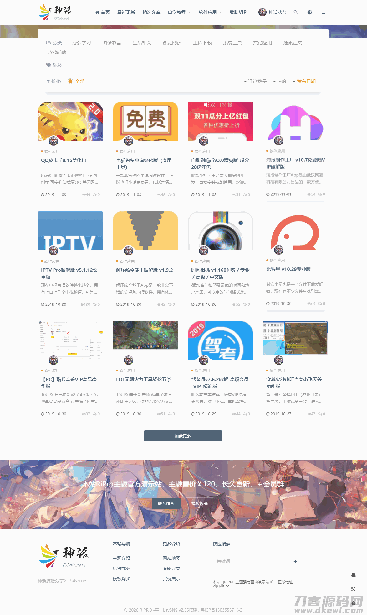 该主题是网上泛滥的RiPro6.3主题仿制而成的laysns模板,原主题是很强大的,全站功能是通过ajax响应实现的,但本人技术有限,只会仿,不会移植,(主要ajax这里不知道怎么弄)。另外就是网上流传得比较多的是美化版,我仿时不知道,于是现在弄出来的是官网的那样版本,总之我会在下个版本更新成美化版的。