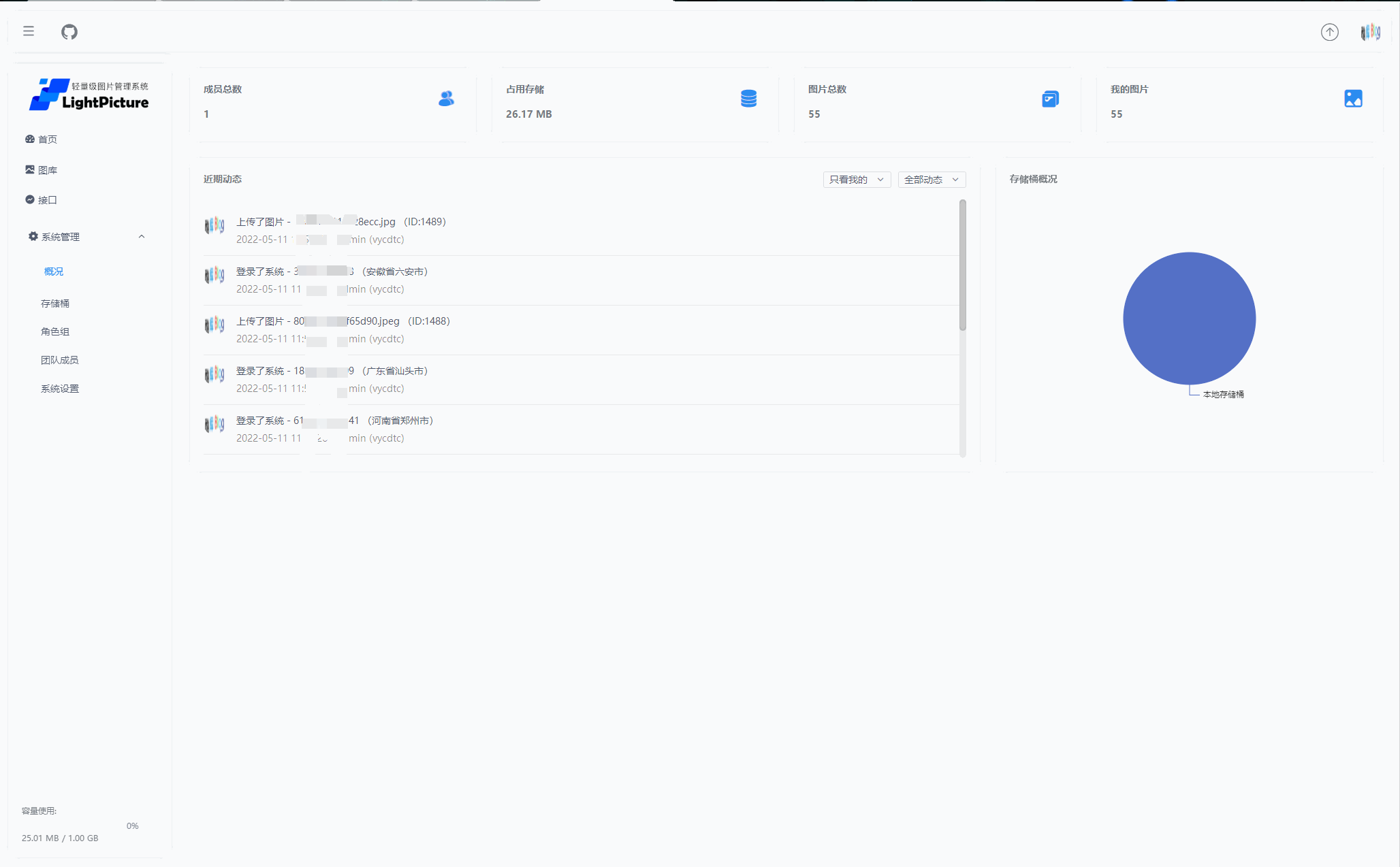 LightPicture – 开源图床系统 高性能、精致、扁平化、多样化储存式的企业化免费图床程序,LightPicture图床系统支持第三方云储存,本地、阿里云 OSS、腾讯云 COS、七牛云 支持多桶储存,可同时添加多个对象存储桶管理 多图上传、拖拽上传、粘贴上传、上传预览、全屏预览、一键复制图片外链 多用户管理、分组管理;不同分组用户控制不同的存储桶 完整的权限控制功能,不同用户组可分配不同的操作权限,控制其上传删除及查看 完整的可视化日志功能,记录用户所有操作,方便事件溯源 全局配置用户初始剩余储存空间、设置指定用户剩余储存空间 支持接口上传、接口删除 原创Geek扁平化页面风格,简约大气;前端使用vue开发,前后端分离