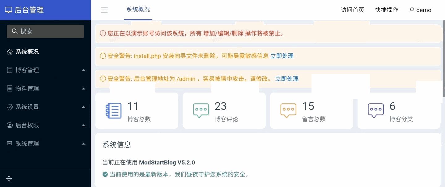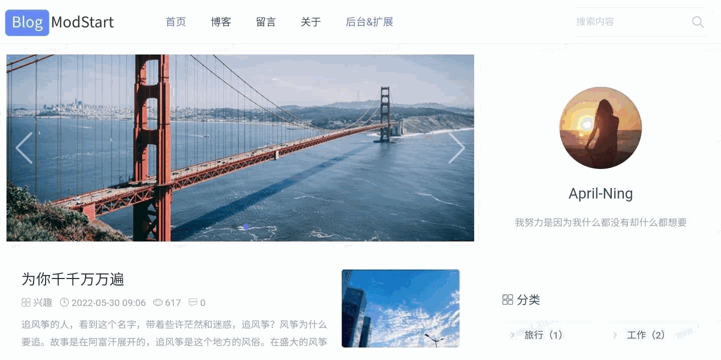 ModStartBlog 是一个基于 Laravel 现代化个人博客系统。模块市场拥有丰富的功能应用,支持后台一键快速安装,让开发者能快的实现业务功能开发。系统完全开源,基于 Apache 2.0 开源协议。