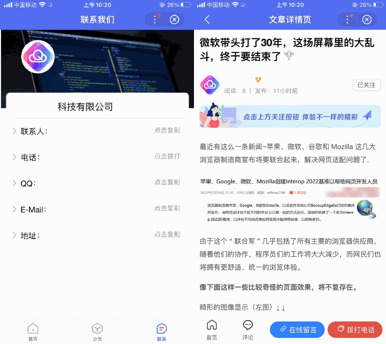 小程序端功能介绍首页,无限加载内容列表分类页,展示网站的全部栏目列表页,自动识别无图、单图、多图详情页,展示文章、相关推荐、引导关注、语音播报、电话拨号、智能客服开关、互动组件在线留言,提交到网站在线留言网站端功能介绍自定义banner自定义金刚位可选择首页显示的栏目自定义详情页logo图、引导关注图片可选择是否启用智能客服支持后台推送百度小时级收录API支持后台推送百度天级收录API支持后台推送百度搜索组件资源提交