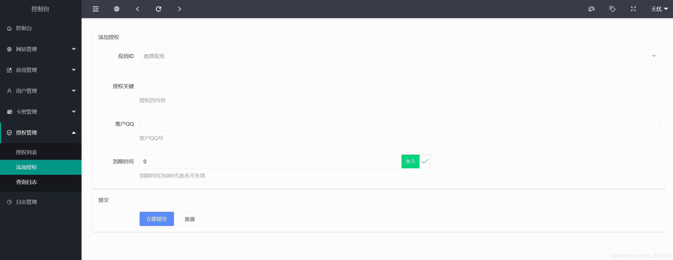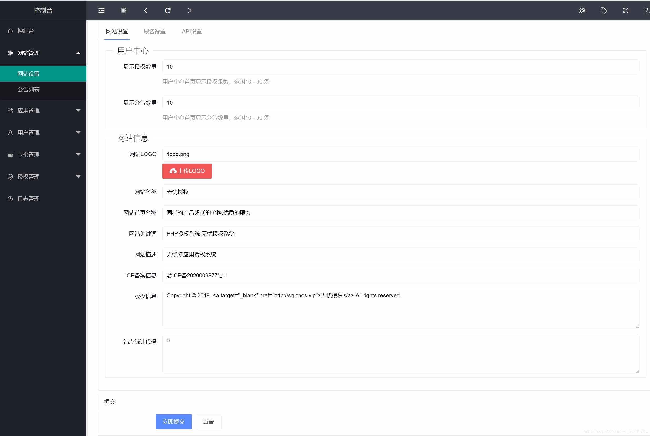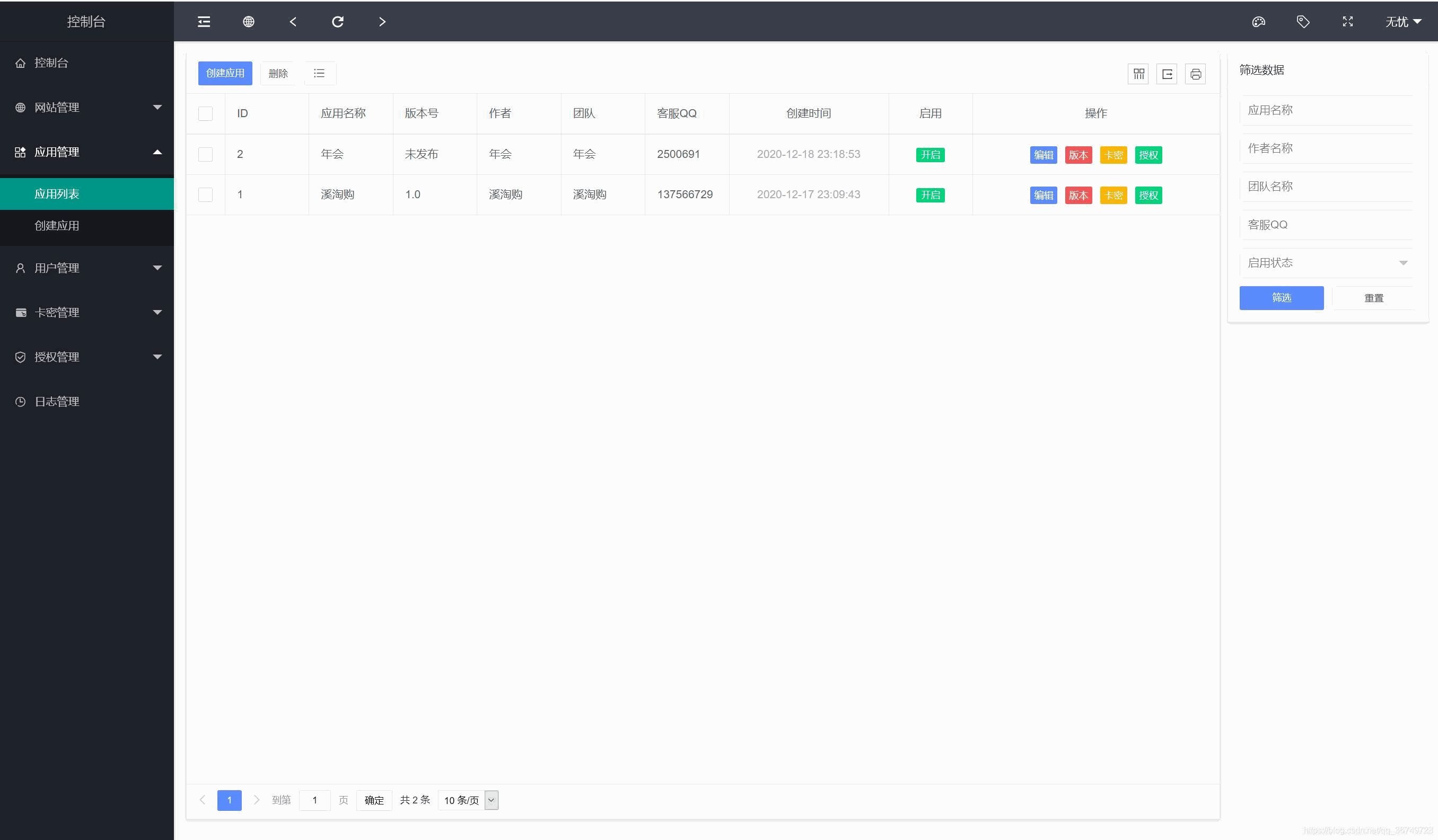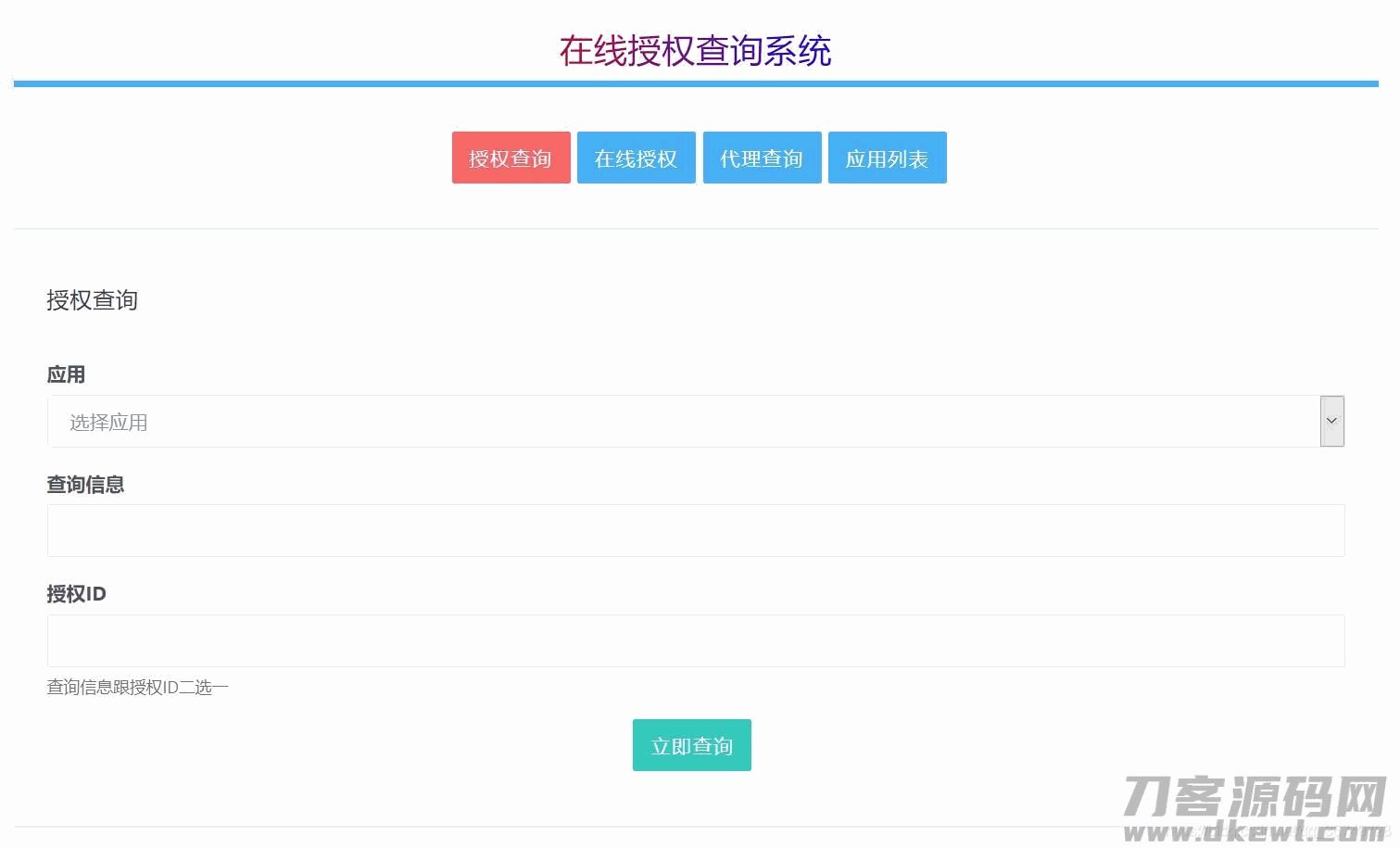 前台支持授权查询,卡密在线授权,代理查询,一级应用列表;