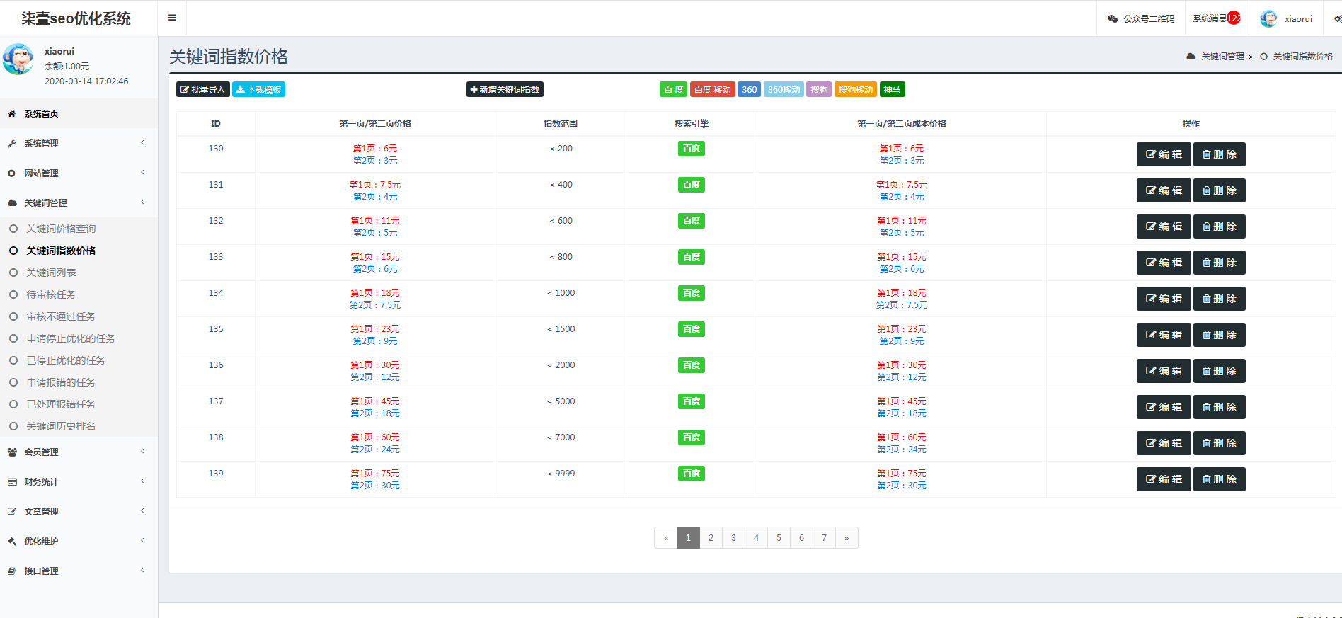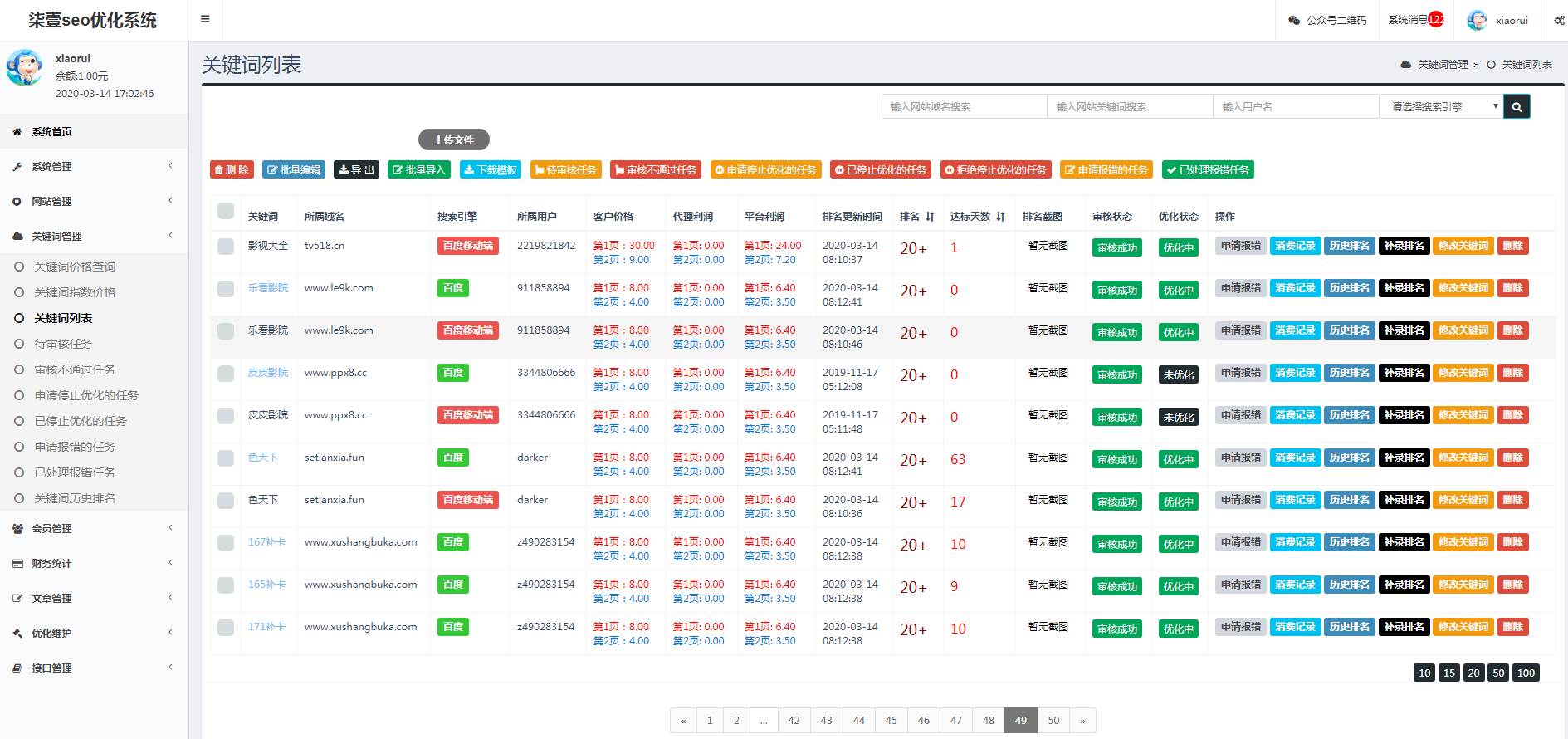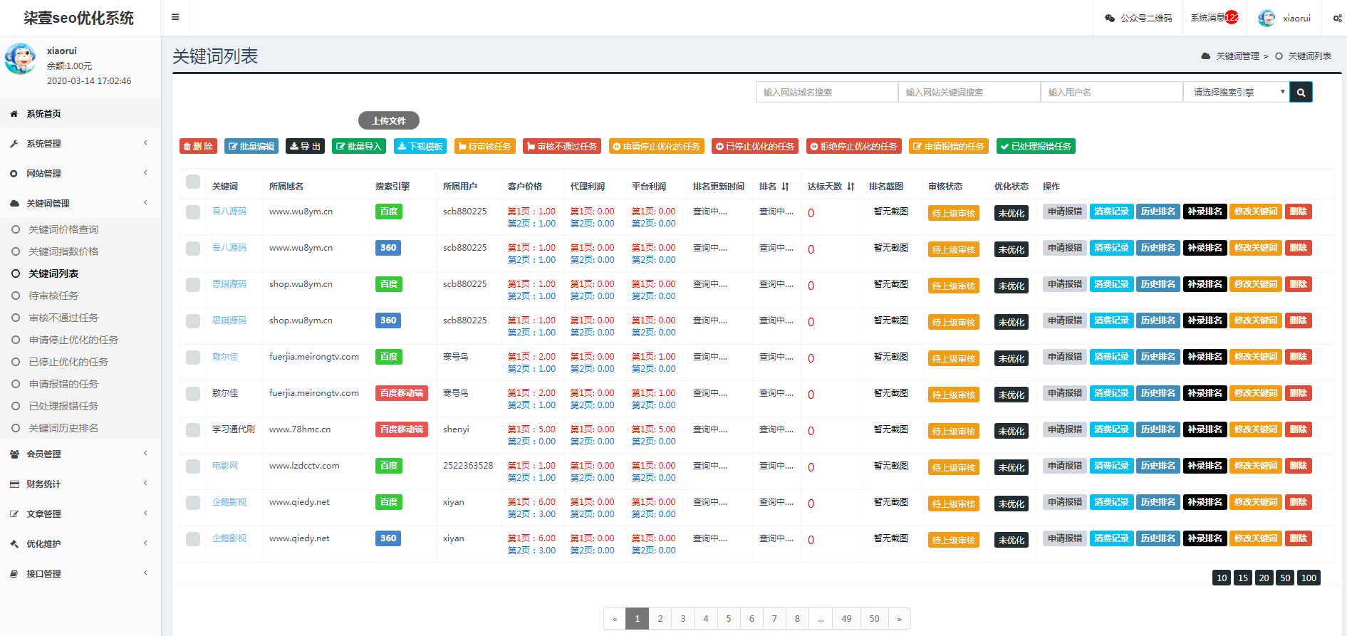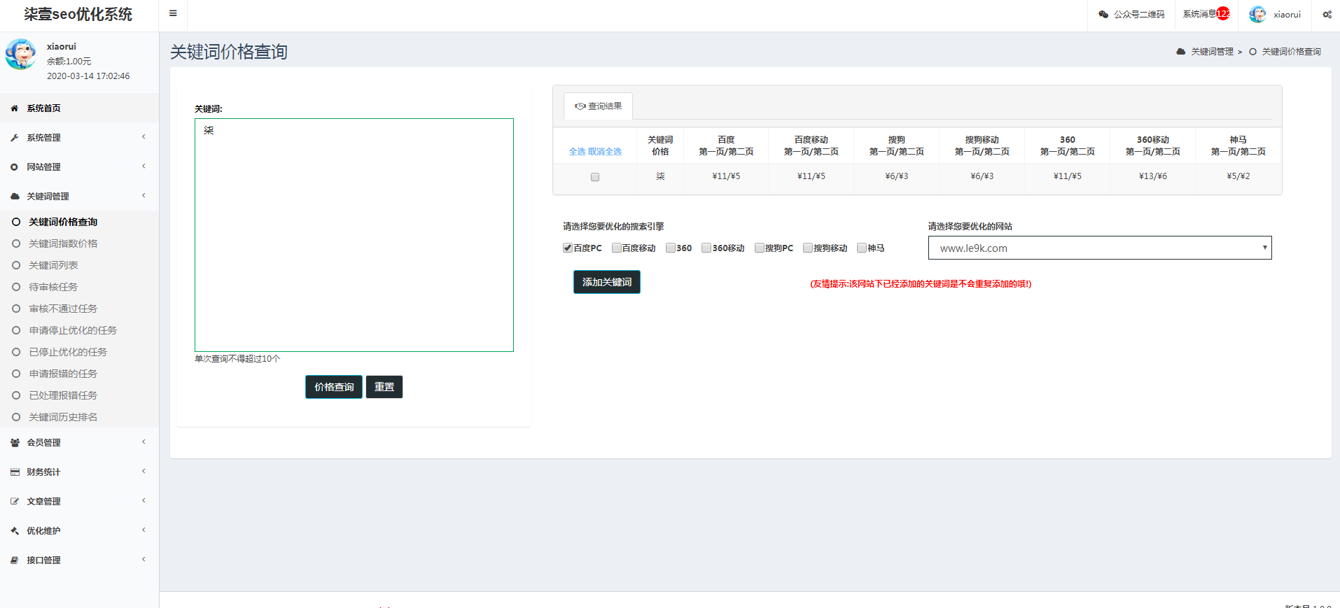 3.关键词管理。总站、代理、普通用户均可添加网站关键词,其中普通用户只能通过关键词价格的方式添加添加关键词,普通用户添加的关键词需要总后台审核;
