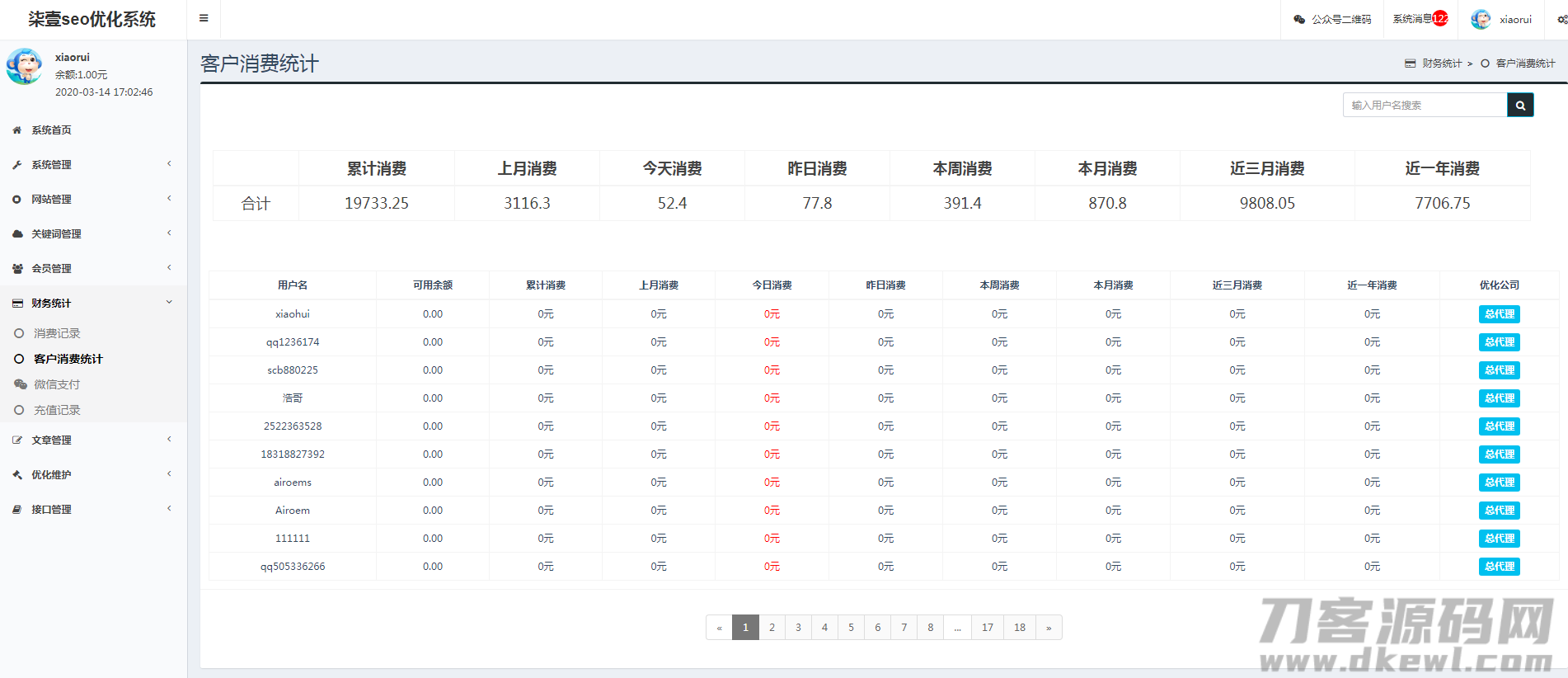 7.财务管理。后台提供清晰、简洁、明了的财务统计分析,总后台及代理用户可以看见所属的代理/用户的可用余额、累计消费、上月消费、本月消费、近3个月消费、近1年消费等情况,同时也可以在后台查看;