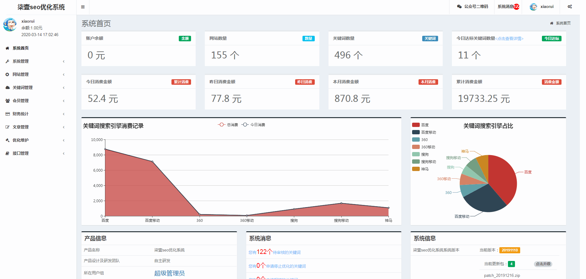 8.在线充值。开发微信扫码支付功能; 9. 利润分析,利润统计,各个搜索引擎关键词的达标数量,最近7日达标数量,折线图和柱状图展示,方便你查看!!!