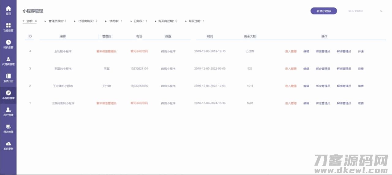 代理商管理:拥有底层源码系统,发展自己的代理商,列表清晰展示各代理商状态,详细设置对代理商账号信息、创建小程序的个数、系统到期时间等进行管理。